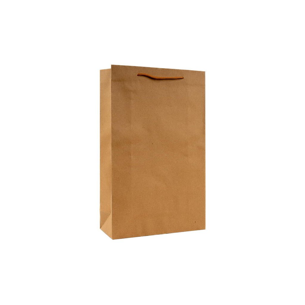 Jedná se o velkou dárkovou tašku vyrobenou z pevného, ekologického papíru v přírodní hnědé barvě. Taška má rozměry 25 x 40 x 10 cm a je vybavena pevnými provázkovými uchy, která jsou uvnitř vyztužená pro větší nosnost. Díky svému jednoduchému a čistému vzhledu je ideální pro reklamní potisk nebo k dalšímu dozdobení.Doplňkové parametry