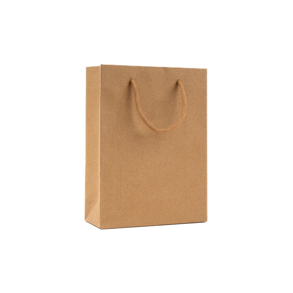 Jedná se o střední dárkovou tašku vyrobenou z pevného, ekologického papíru v přírodní hnědé barvě. Taška má rozměry 19 x 24 x 8 cm a je vybavena pevnými provázkovými uchy, která jsou uvnitř vyztužená pro větší nosnost. Díky svému jednoduchému a čistému vzhledu je ideální pro reklamní potisk nebo k dalšímu dozdobeníDoplňkové parametry