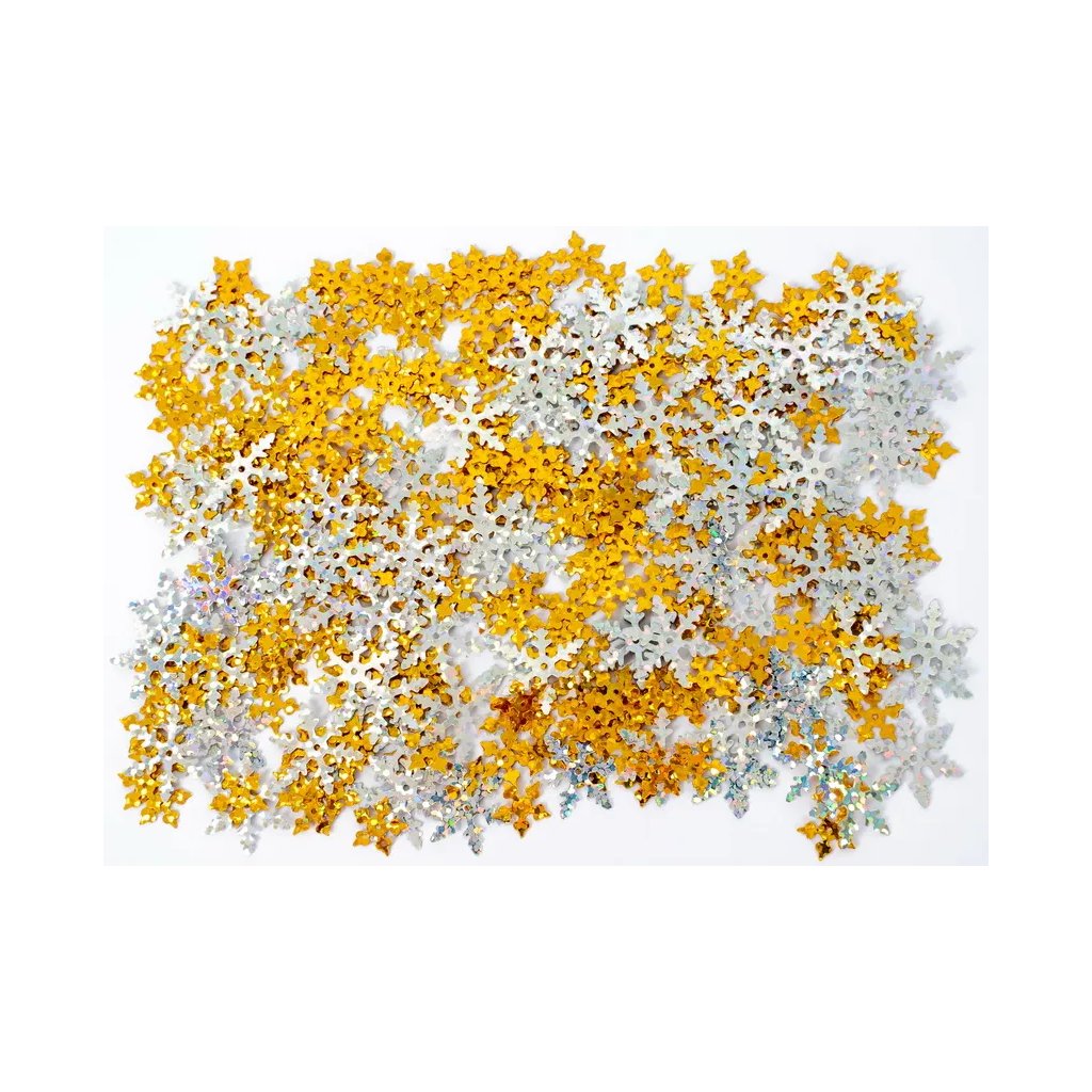 Jedná se o dekorační flitry ve tvaru sněhových vloček, které jsou ideální pro vánoční a zimní kreativní projekty. Balení obsahuje mix zlaté a stříbrné barvy s vysokým leskem, což vytváří třpytivý efekt. Flitry jsou skvělé pro zdobení přání, scrapbookových stránek, kostýmů, balení dárků nebo jako posyp na slavnostní stůl. Balení obsahuje 15 g flitrů.Doplňkové parametry