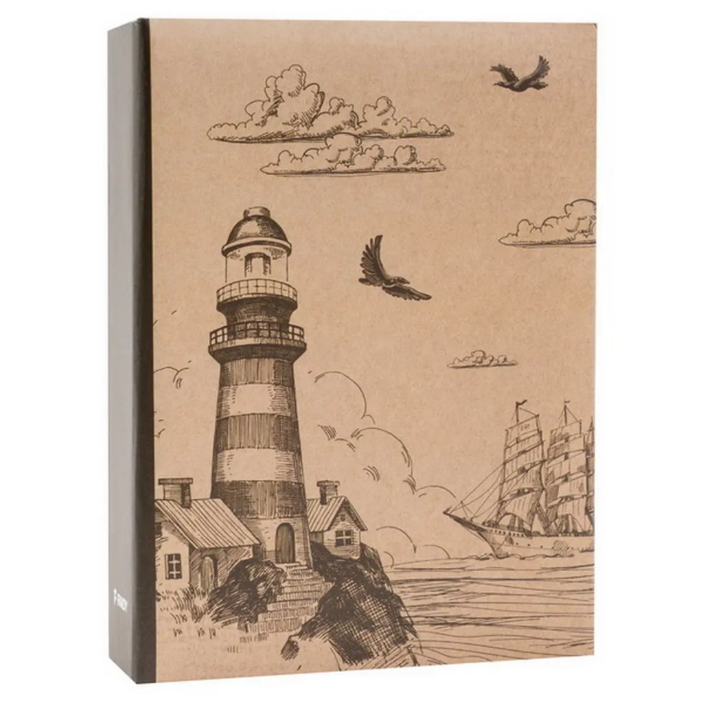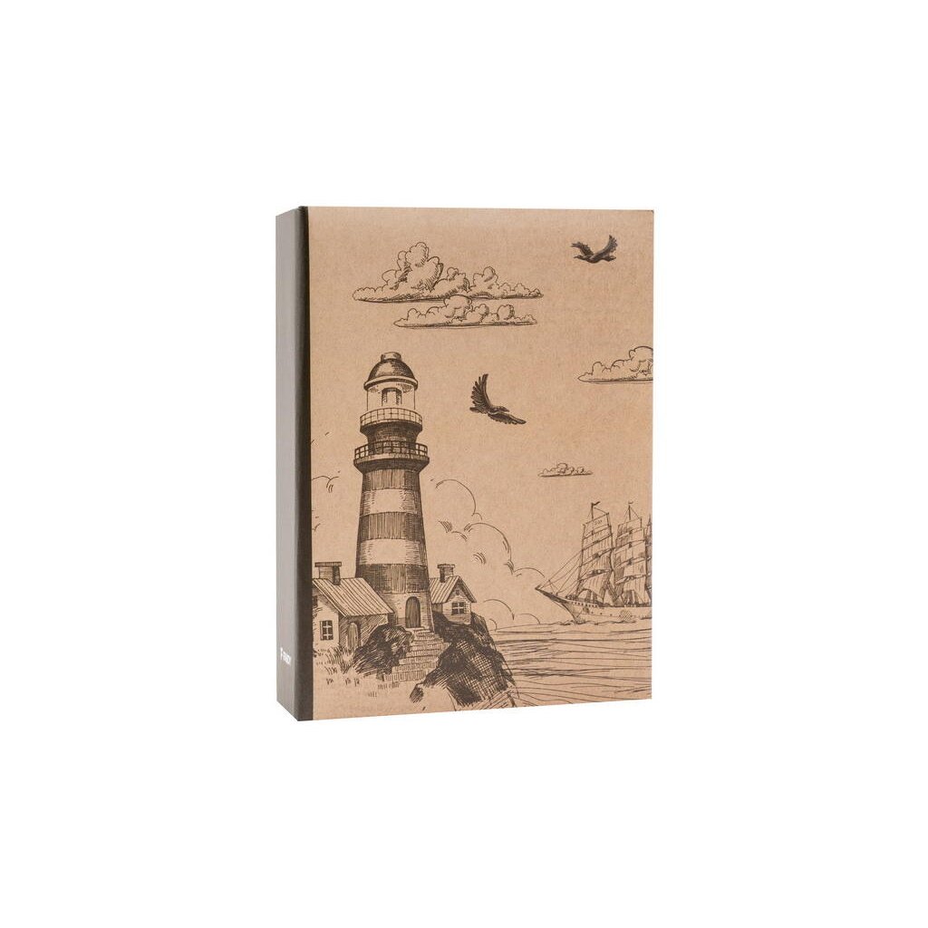 Jedná se o malé a kompaktní zasunovací fotoalbum s laminovanou obálkou v přírodních, hnědých tónech. Album má svařovanou vazbu ve formě knihy. Je ideální pro uchování 100 fotografií formátu 10 x 15 cm, které se vkládají zasouváním, a neumožňuje popisky. Listy jsou vyrobeny z bílého PVC/PP materiálu. Na obálce je vyobrazen retro motiv námořní tematiky tvořený perokresbou v sépiových tónech na hnědém (kraftovém) podkladu. Kresba znázorňuje maják na skalnatém pobřeží s malými domky, plachetnici na moři a siluety ptáků v oblacích. Díky tomuto neutrálnímu a stylovému motivu je album ideální pro uchování vzpomínek z cest, dovolené u moře, nebo jiných cenných zážitků.Doplňkové parametry
