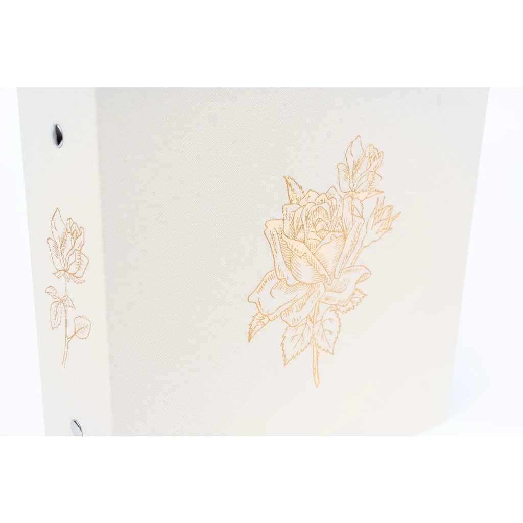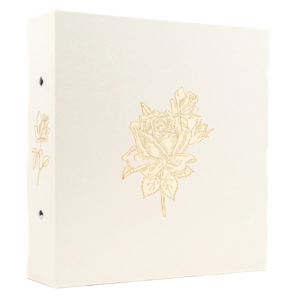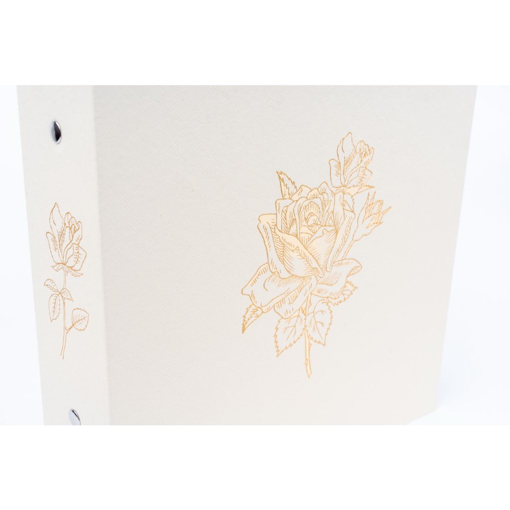 Luxusní svatební zasunovací fotoalbum v čistě bílém provedení zdobí jemná zlatá ražba s motivem rozvetlé růže, která se elegantně opakuje i na hřbetu alba. Toto velkoformátové album s mimořádnou kapacitou pro 1000 fotografií formátu 10 x 15 cm disponuje rozměry 31 x 33,5 cm a je opatřeno vysoce odolnou šroubovanou (nýtovanou) vazbou pro maximální stabilitu. Povrch obálky je potažen kvalitním textilem, který dodává albu slavnostní charakter, zatímco vnitřní černé PVC/PP listy bez popisek nechávají barvy vašich svatebních snímků dokonale vyniknout.Doplňkové parametry