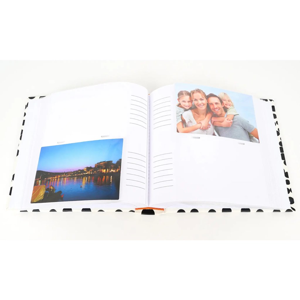 Uchovejte si vzpomínky ve fotoalbu s elegantním černobílým vzorem. Album má šitou vazbu a desky z imitace kůže, díky čemuž je velmi odolné. Pojme až 200 fotografií ve formátu 10 x 15 cm, které se vkládají dvě nad sebe. U každé fotografie je navíc místo pro vlastní poznámky.Doplňkové parametry
