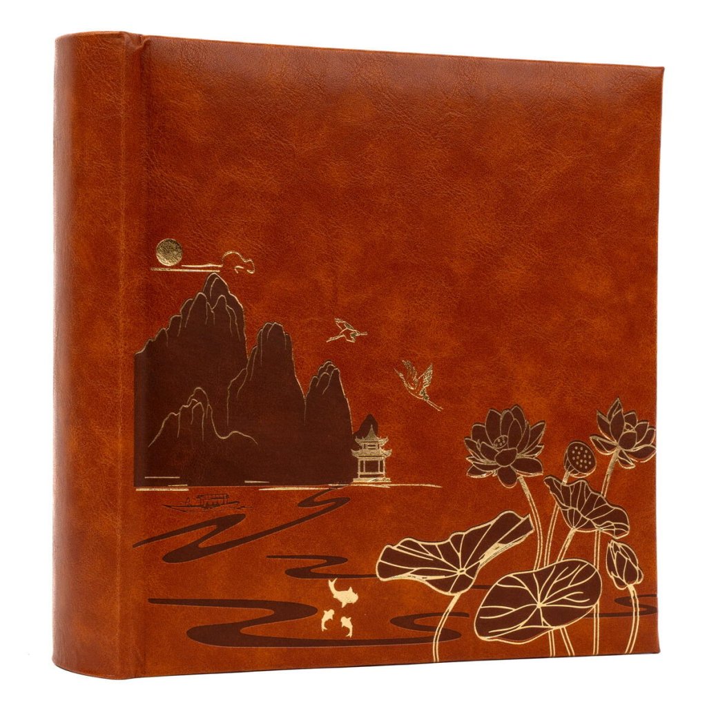 Elegantní zasunovací fotoalbum v hnědém provedení s motivem lotosu, hor a přírody vyniká svou kvalitní šitou vazbou, která připomíná klasickou knihu a zajišťuje dlouhou životnost. Album o rozměru 22 x 22 cm pojme celkem 200 fotografií formátu 10 x 15 cm, přičemž na každou stránku lze pohodlně umístit 2 snímky. Obálka z imitace kůže chrání vaše vzpomínky, zatímco vnitřní bílo-béžové papírové listy disponují praktickým prostorem pro popisky přímo po stranách fotografií.Doplňkové parametry