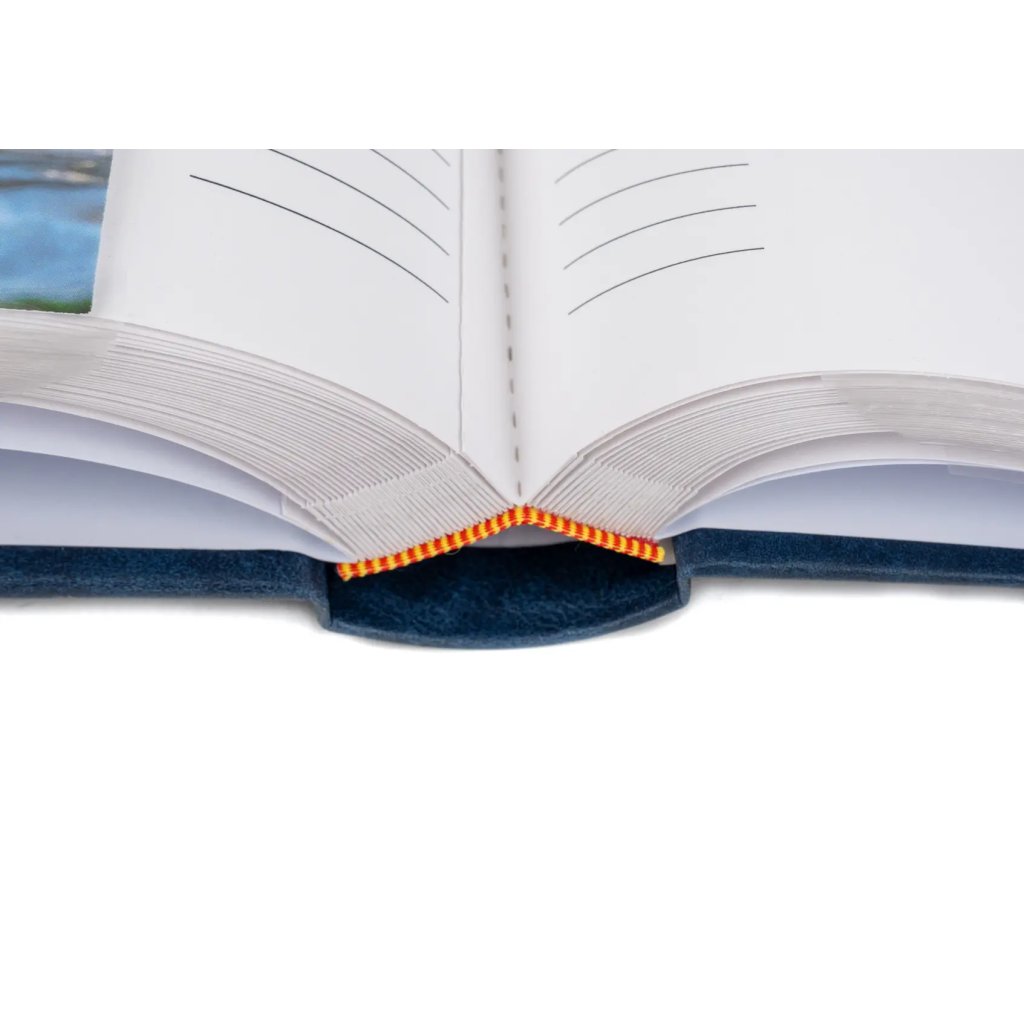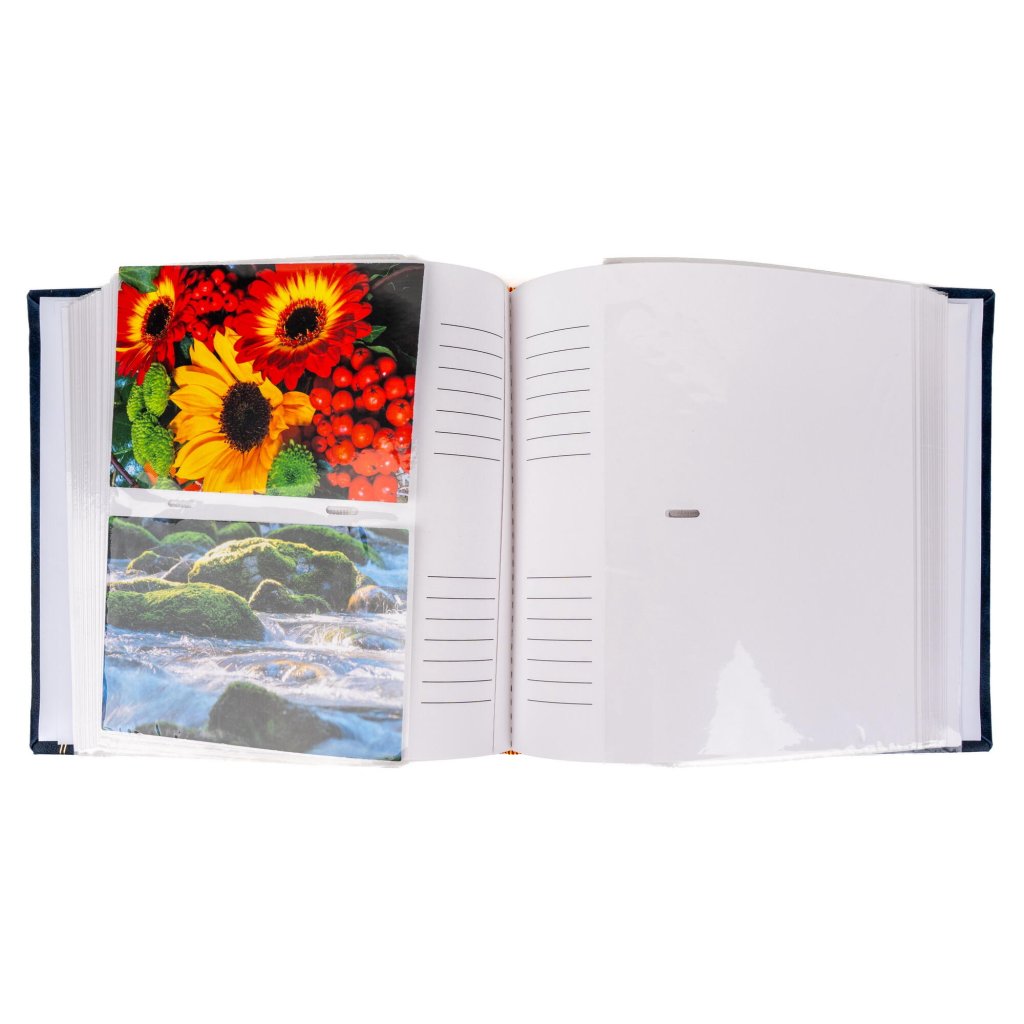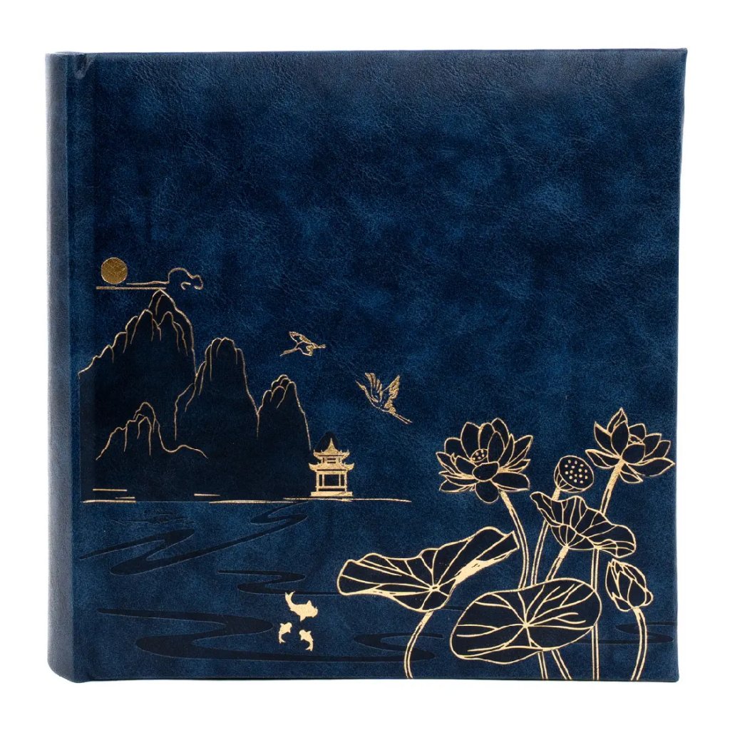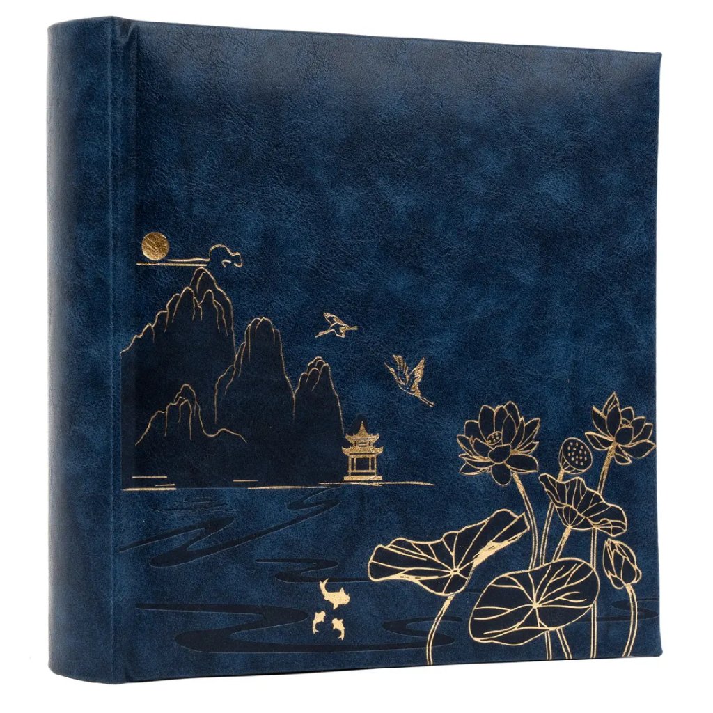 Elegantní zasunovací fotoalbum v hluboké modré barvě se zlatým motivem lotosu, hor a přírody se vyznačuje kvalitní šitou vazbou, která zaručuje pevnost a dlouhou životnost podobně jako u klasické knihy. Album o čtvercovém rozměru 22 x 22 cm pojme celkem 200 fotografií formátu 10 x 15 cm, přičemž na každou stránku se vejdou 2 snímky vedle sebe. Obálka z imitace kůže s jemnou texturou chrání vaše vzpomínky a vnitřní bílo-béžové papírové listy nabízejí praktický prostor pro popisky umístěný po stranách fotografií.Doplňkové parametry