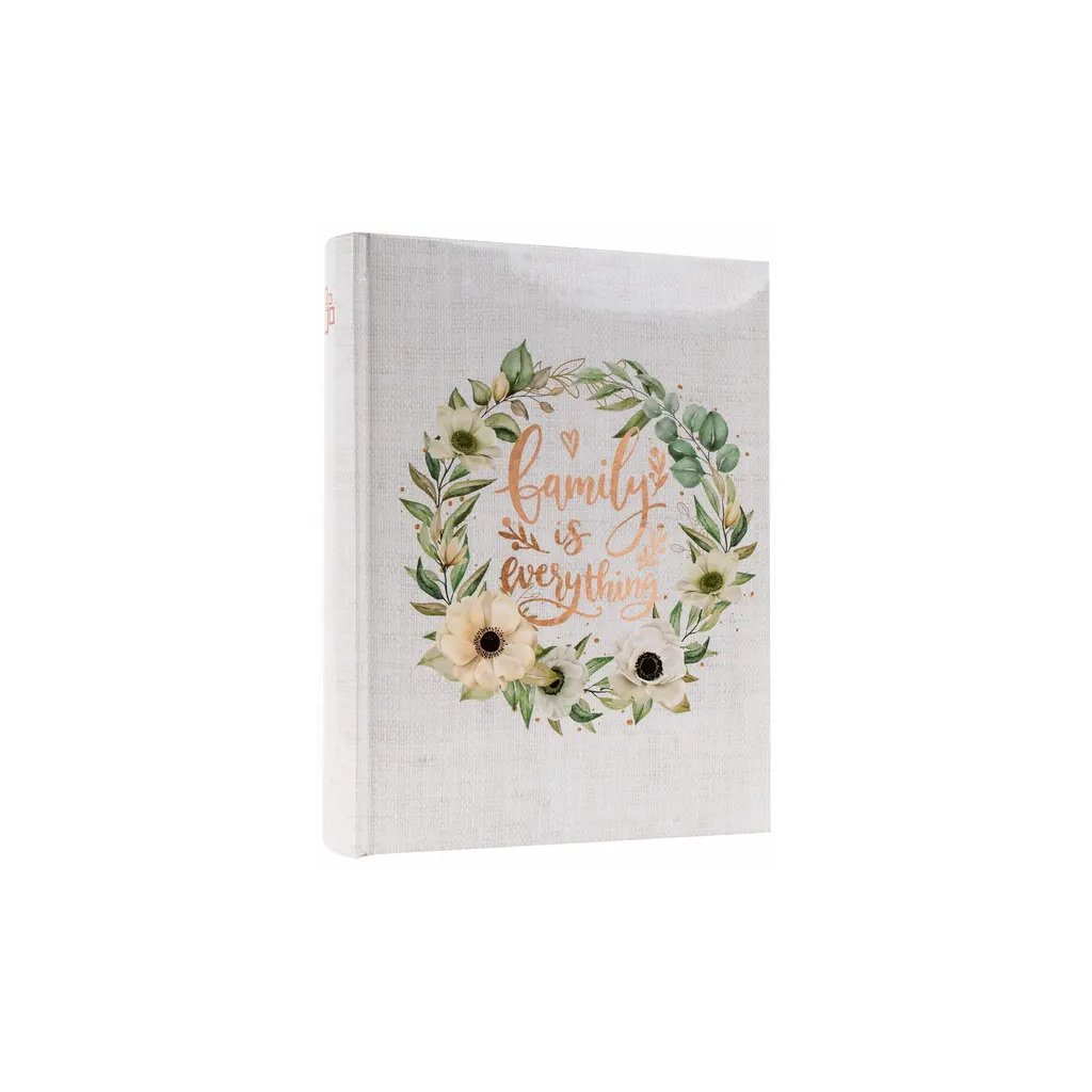 Uchovejte si vzpomínky na rodinné chvíle v tomto elegantním fotoalbu s květinovým věncem a nápisem "Family is everything". Pevné desky z laminovaného papíru a šitá vazba zaručují odolnost a dlouhou životnost. Album pojme až 200 fotografií ve formátu 10 x 15 cm, které se vkládají dvě nad sebe. Mezi fotografiemi je navíc prostor pro vlastní popisky, díky kterým si snadno uchováte všechny důležité okamžiky.Doplňkové parametry