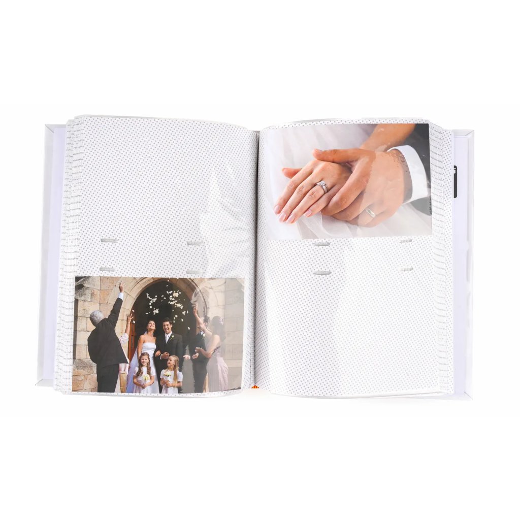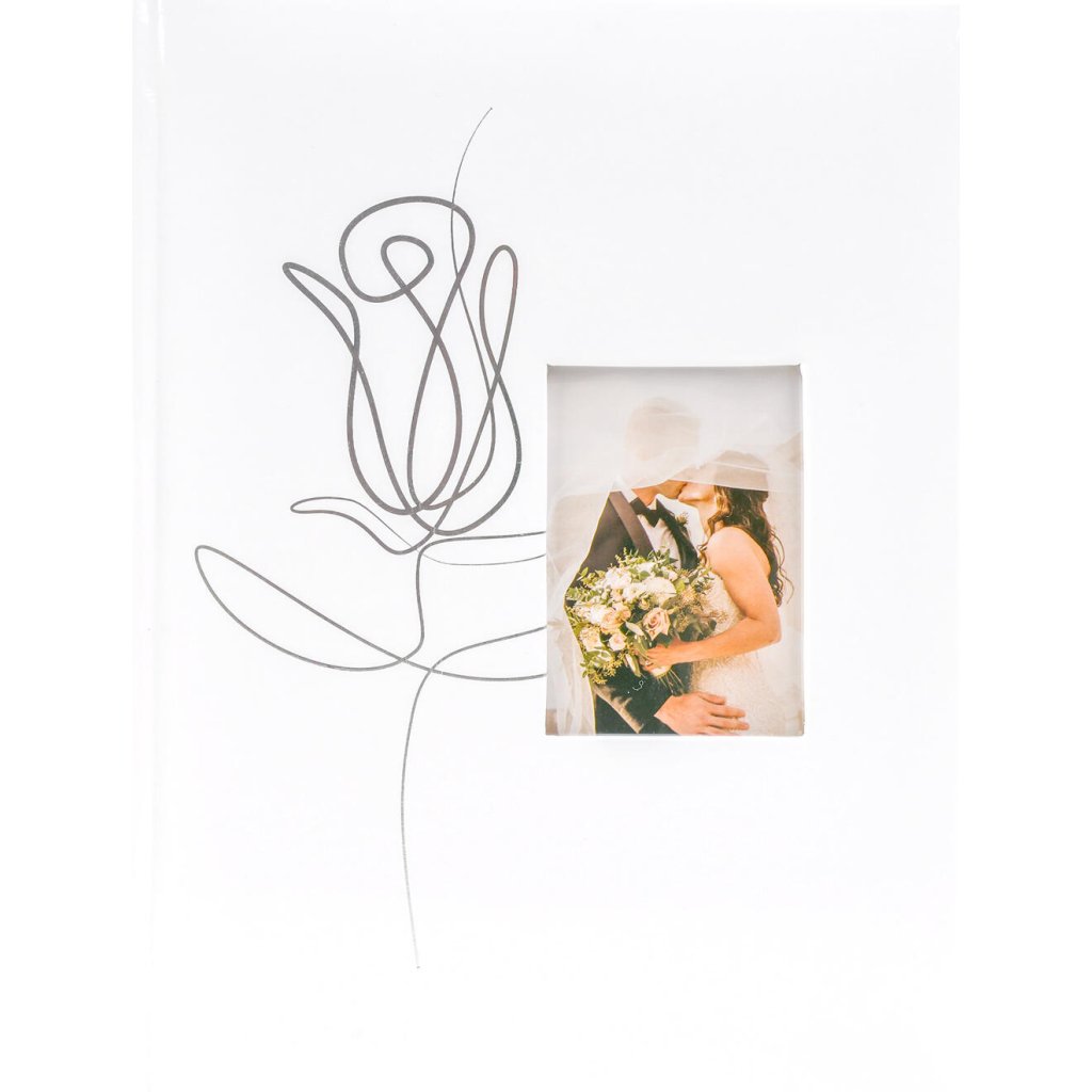 Uchovejte si vzpomínky na svůj svatební den v tomto bílém fotoalbu s motivem stříbrné růže. Pevné desky z laminovaného papíru s možností vložení vlastní fotografie na obal a šitá vazba zaručují odolnost a dlouhou životnost. Album pojme až 200 fotografií ve formátu 10 x 15 cm, které se vkládají dvě nad sebe. Mezi fotografiemi je navíc prostor pro vlastní popisky, díky kterým si snadno uchováte všechny důležité okamžiky.Doplňkové parametry