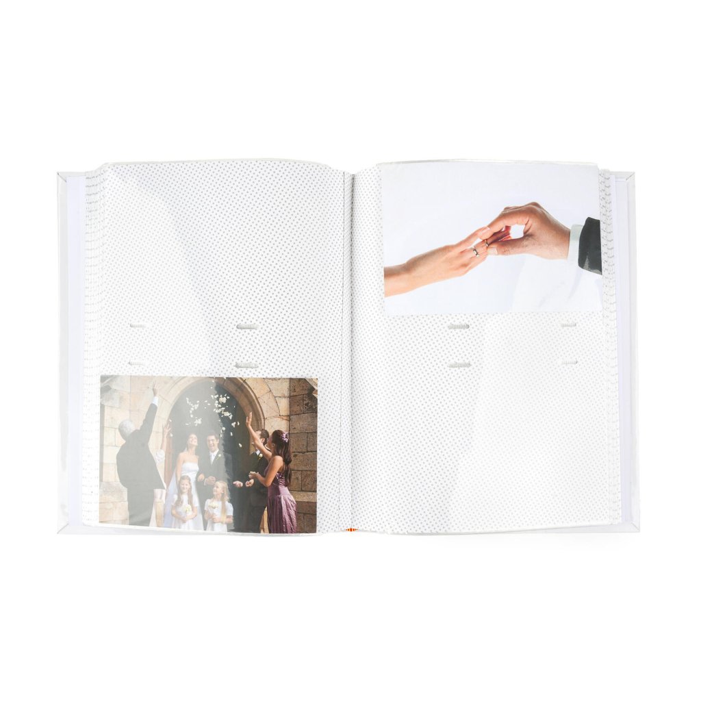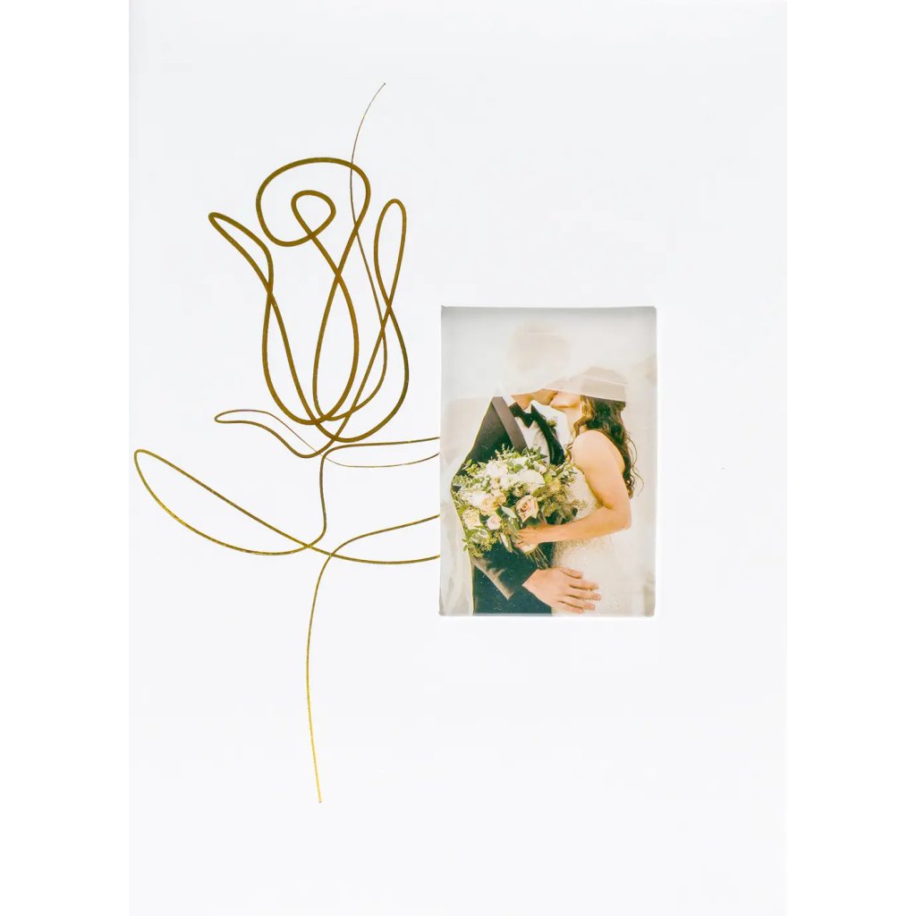 Uchovejte si vzpomínky na svůj svatební den v tomto bílém fotoalbu s motivem zlaté růže. Pevné desky z laminovaného papíru s možností vložení vlastní fotografie na obal a šitá vazba zaručují odolnost a dlouhou životnost. Album pojme až 200 fotografií ve formátu 10 x 15 cm, které se vkládají dvě nad sebe. Mezi fotografiemi je navíc prostor pro vlastní popisky, díky kterým si snadno uchováte všechny důležité okamžiky.Doplňkové parametry