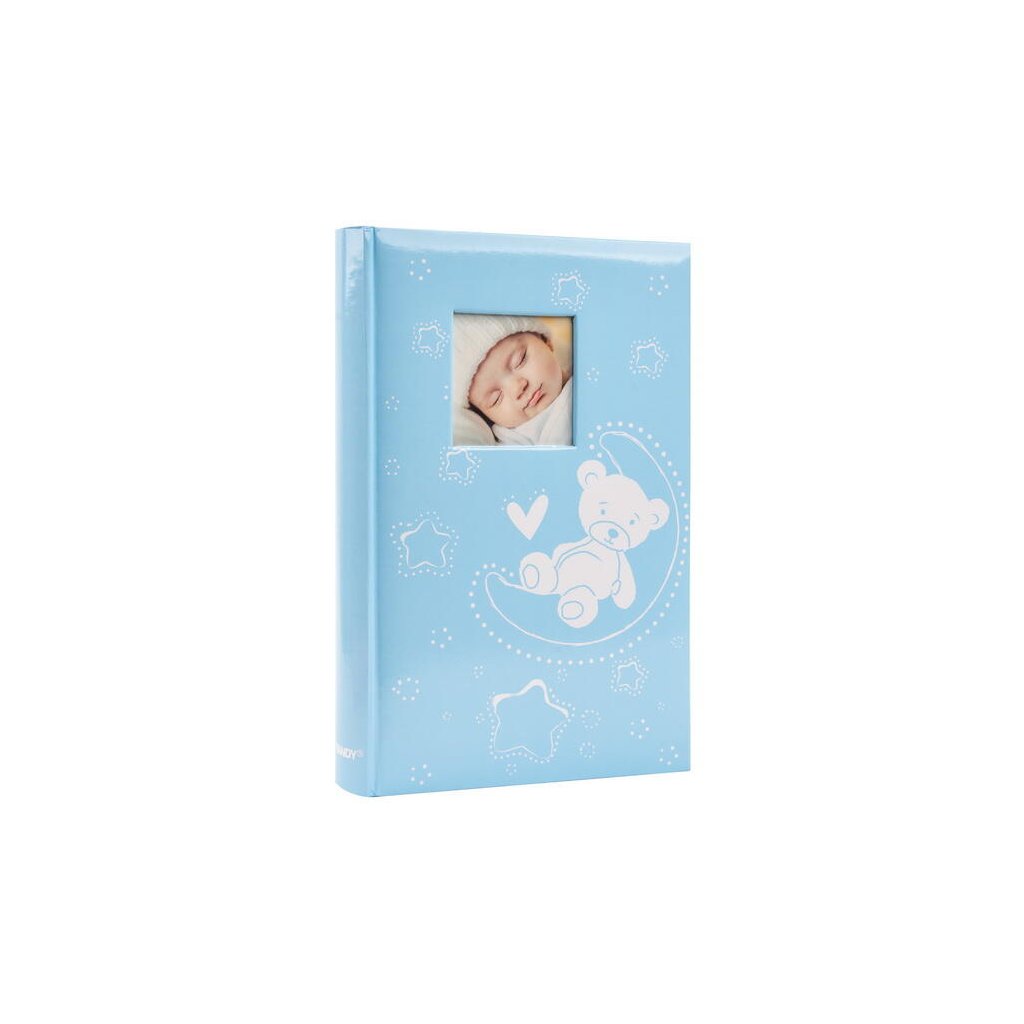 Jedná se o roztomilé dětské fotoalbum s laminovanou obálkou ve světle modré barvě. Album má šitou vazbu, která zaručuje jeho dlouhou životnost. Je určeno pro 300 fotografií formátu 10 x 15 cm, které se vkládají zasouváním tři nad sebe na stránku. U každé fotografie je prostor pro popisky. Listy jsou vyrobeny z bílého papíru. Na obálce je vyobrazen veselý motiv medvídka sedícího na půlměsíci s hvězdičkami. V horní části obálky je okénko pro vložení vlastní vyměnitelné fotografie (např. fotografie dítěte), což dodává albu osobní ráz. Je to skvělý dárek pro novopečené rodiče k uchování vzpomínek na první roky života dítěte.Doplňkové parametry