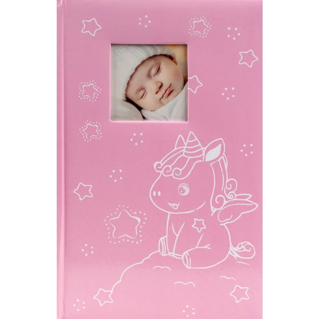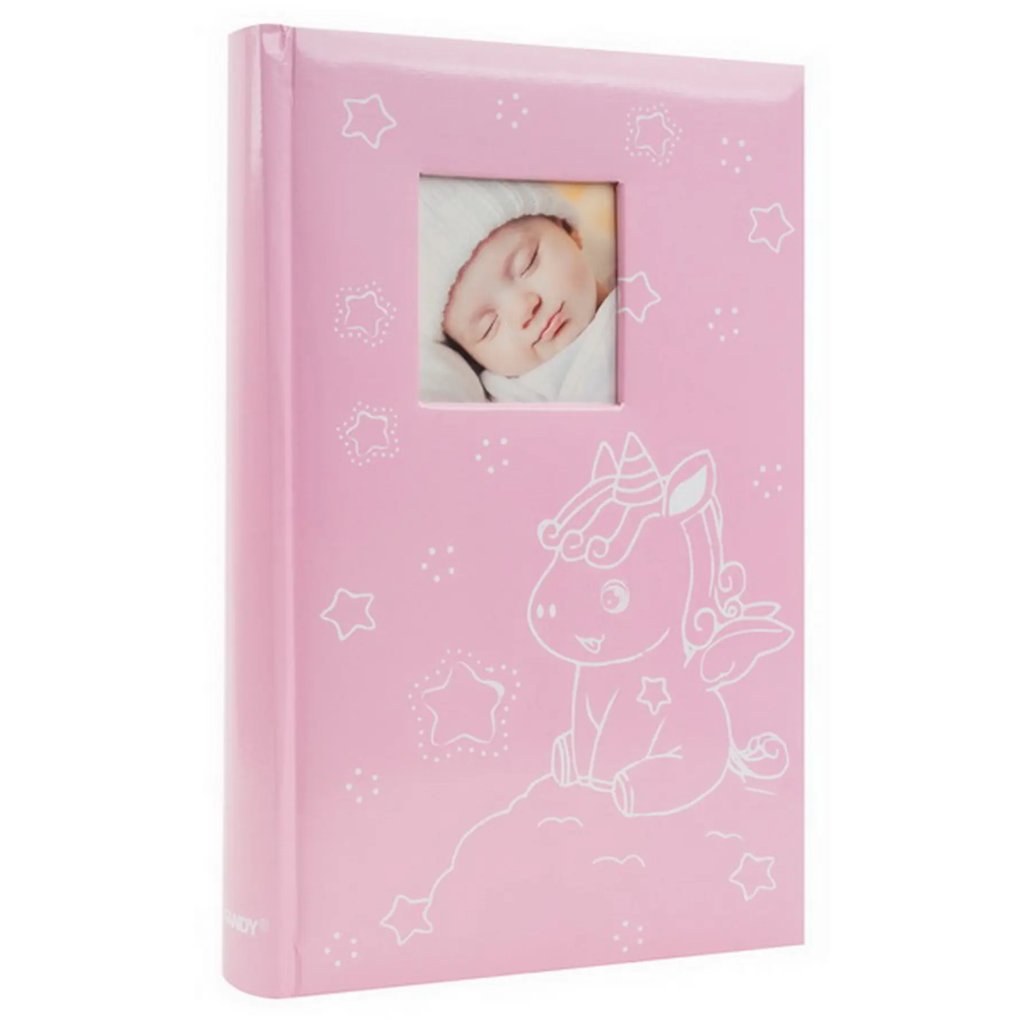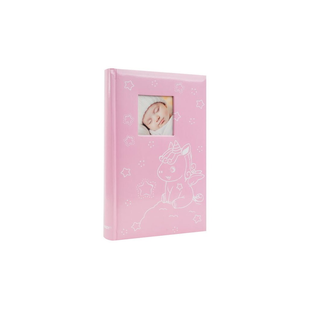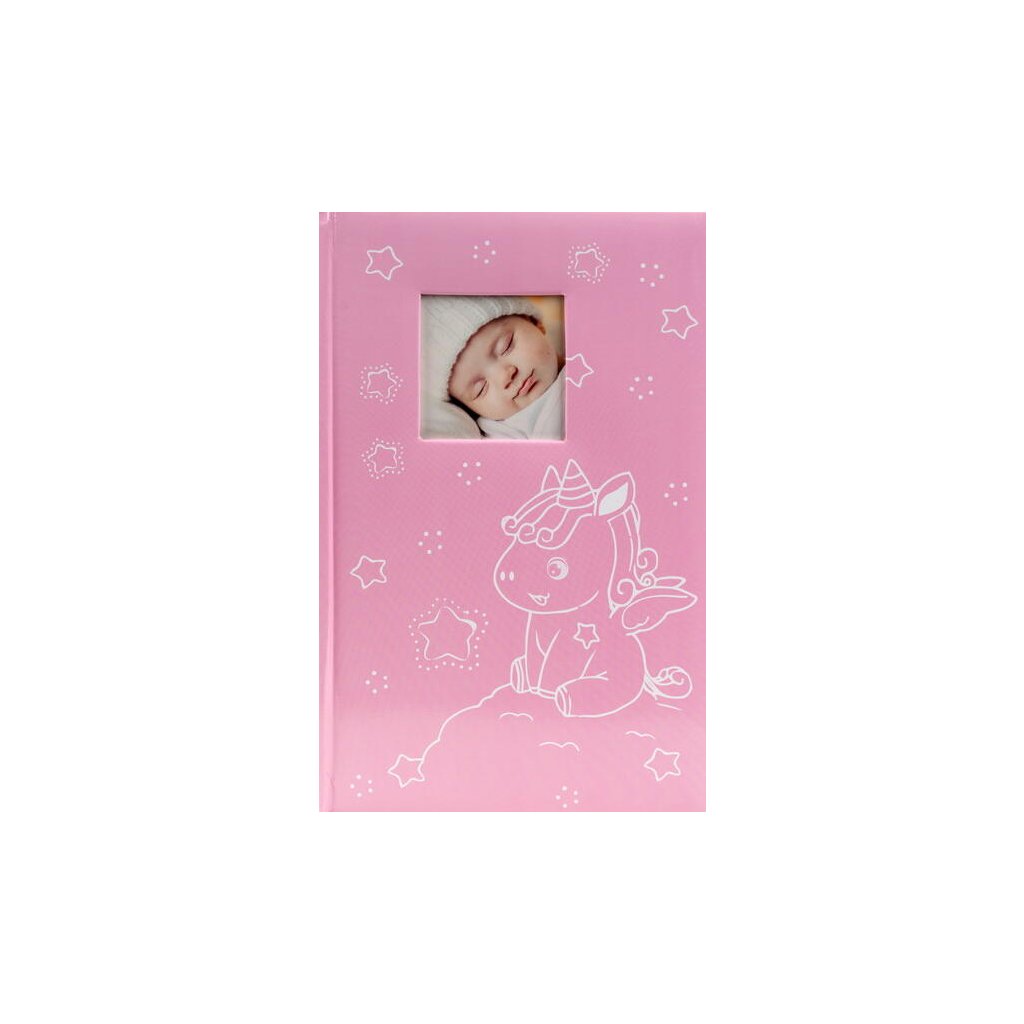 Jedná se o roztomilé dětské fotoalbum s laminovanou obálkou v sytě růžové barvě. Album má šitou vazbu, která zaručuje jeho dlouhou životnost. Je určeno pro 300 fotografií formátu 10 x 15 cm, které se vkládají zasouváním (tři nad sebe na stránku). U každé fotografie je prostor pro popisky. Listy jsou vyrobeny z bílého papíru. Na obálce je vyobrazen veselý motiv sedícího jednorožce obklopeného hvězdičkami. V horní části obálky je okénko pro vložení vlastní vyměnitelné fotografie (např. fotografie dítěte), což dodává albu osobní ráz. Je to skvělý dárek pro novopečené rodiče k uchování vzpomínek na první roky života dítěte.Doplňkové parametry