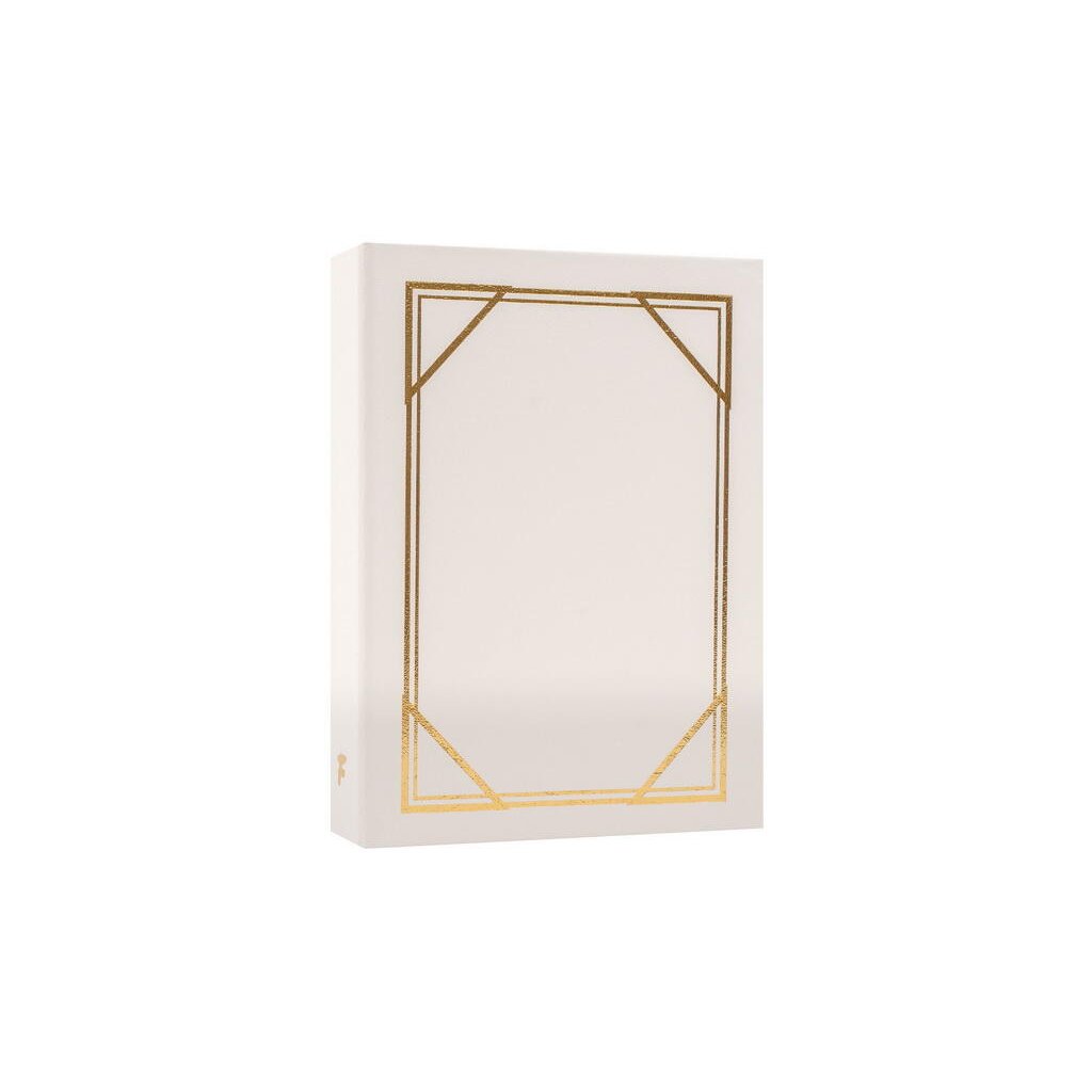 Jedná se o malé a kompaktní zasunovací fotoalbum s deskami potaženými vinylovou koženkou v bílé barvě. Album má svařovanou vazbu ve formě knihy. Je ideální pro uchování 36 fotografií formátu 10 x 15 cm, které se vkládají zasouváním, a neumožňuje popisky. Listy jsou vyrobeny z bílého PVC/PP materiálu. Na obálce je po obvodu vyobrazen jednoduchý zlatý geometrický rámeček. Díky svému luxusnímu a jednobarevnému designu je album ideální pro uchování vzpomínek z cest, svateb nebo jiných cenných zážitků.Doplňkové parametry