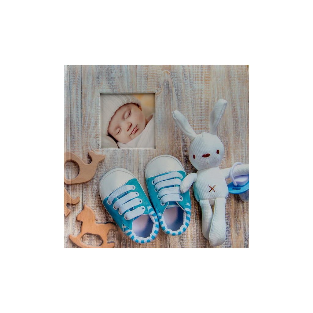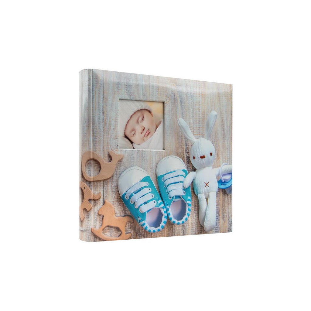 Jedná se o roztomilé dětské fotoalbum s laminovanou obálkou v modrém motivu. Album má šitou vazbu, která zaručuje jeho dlouhou životnost. Je určeno pro uchování až 500 fotografií formátu 10 x 15 cm, které se vkládají zasouváním. U každé fotografie je prostor pro popisky. Listy jsou vyrobeny z bílého papíru. Na obálce je vyobrazen veselý motiv s dětskou tematikou, který zahrnuje pleteného králíčka, modré botičky a dřevěné hračky na pozadí motivu/dekoru dřeva. V horní části obálky je okénko pro vložení vlastní vyměnitelné fotografie (např. fotografie dítěte), což dodává albu osobní ráz. Je to skvělý dárek pro novopečené rodiče k uchování vzpomínek na první roky života dítěte.Doplňkové parametry