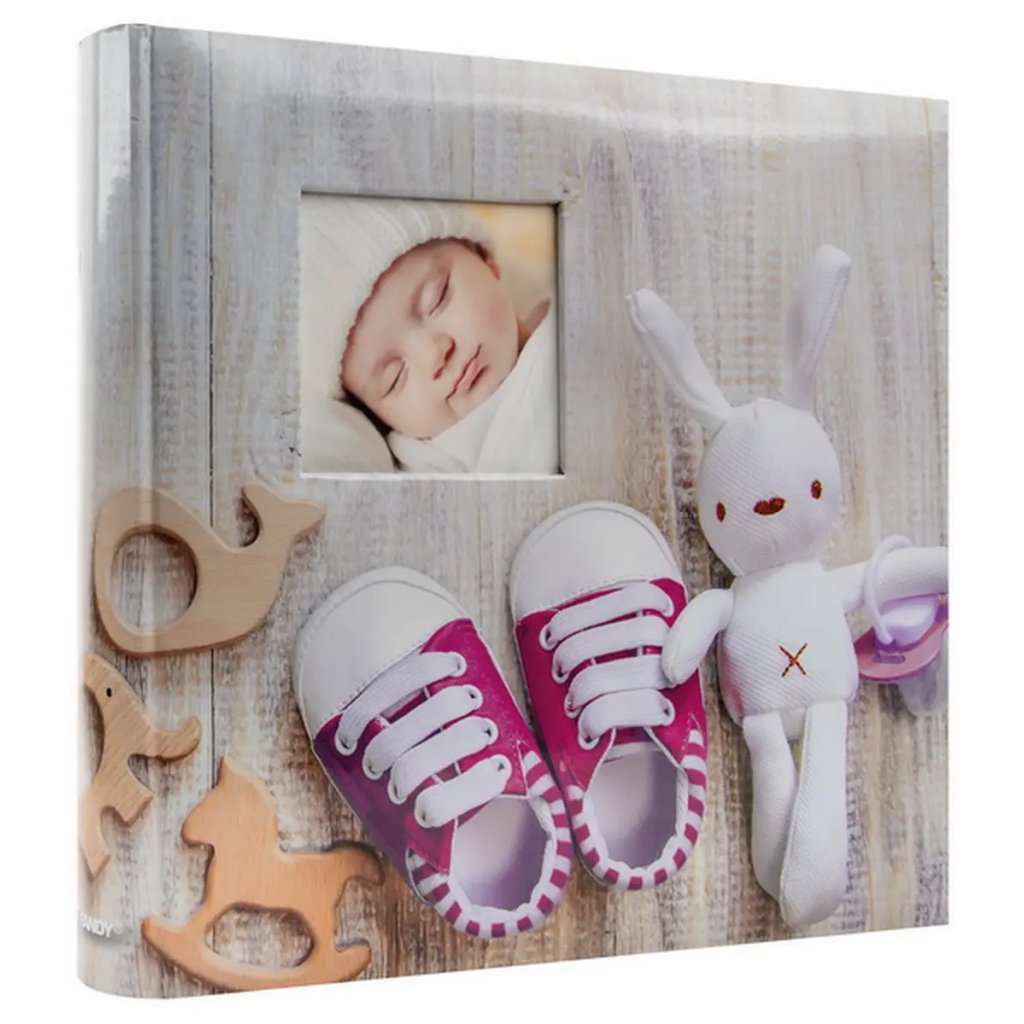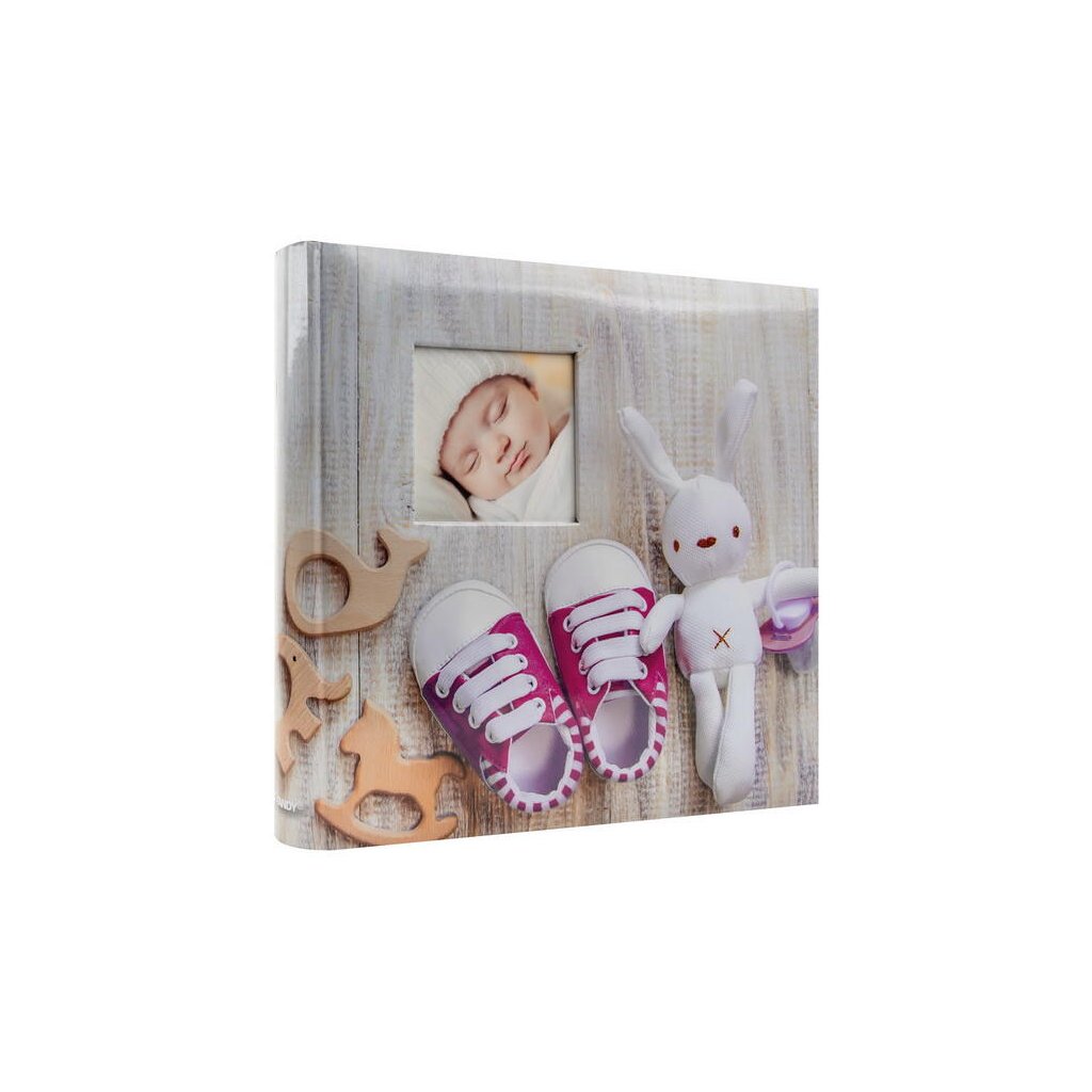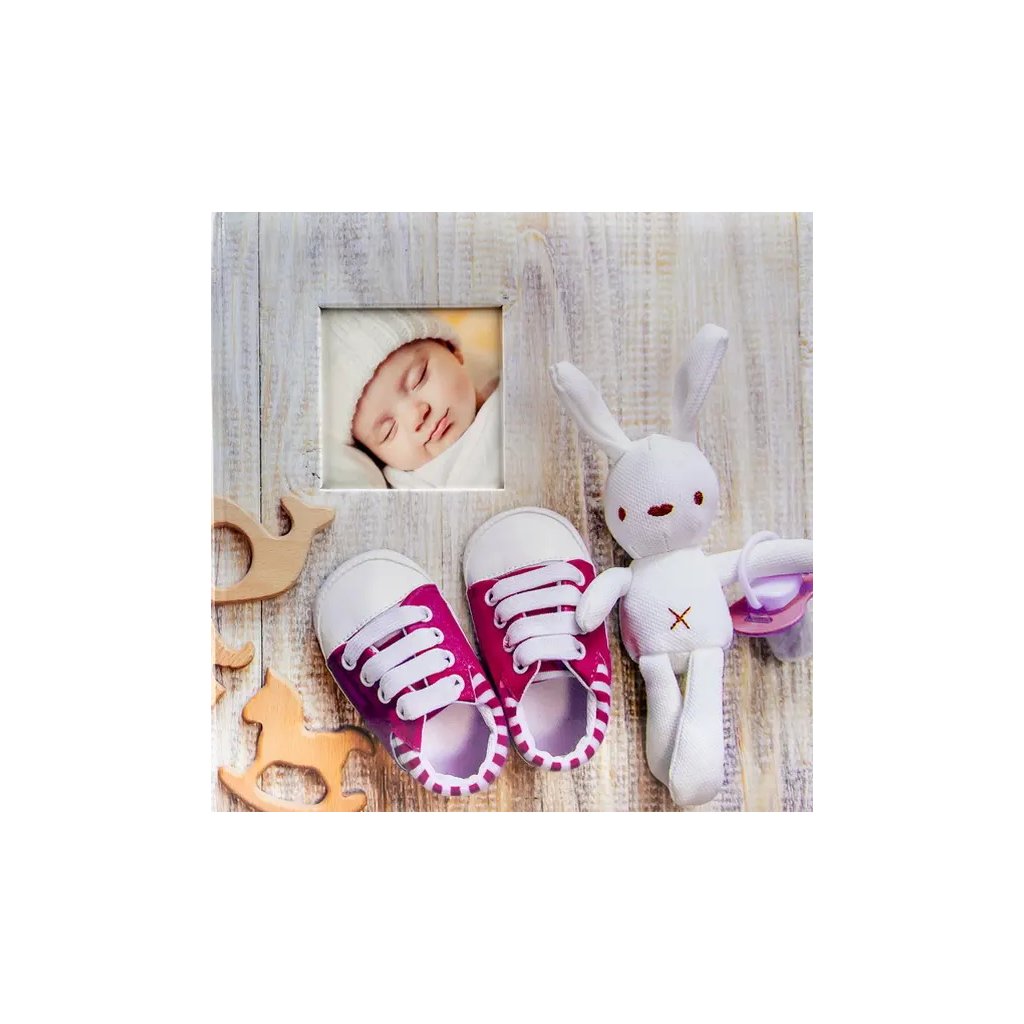 Jedná se o roztomilé dětské fotoalbum s laminovanou obálkou v růžovém motivu. Album má šitou vazbu, která zaručuje jeho dlouhou životnost. Je určeno pro uchování až 500 fotografií formátu 10 x 15 cm, které se vkládají zasouváním. U každé fotografie je prostor pro popisky. Listy jsou vyrobeny z bílého papíru. Na obálce je vyobrazen veselý motiv s dětskou tematikou, který zahrnuje pleteného králíčka, modré botičky a dřevěné hračky na pozadí motivu/dekoru dřeva. V horní části obálky je okénko pro vložení vlastní vyměnitelné fotografie (např. fotografie dítěte), což dodává albu osobní ráz. Je to skvělý dárek pro novopečené rodiče k uchování vzpomínek na první roky života dítěte.Doplňkové parametry