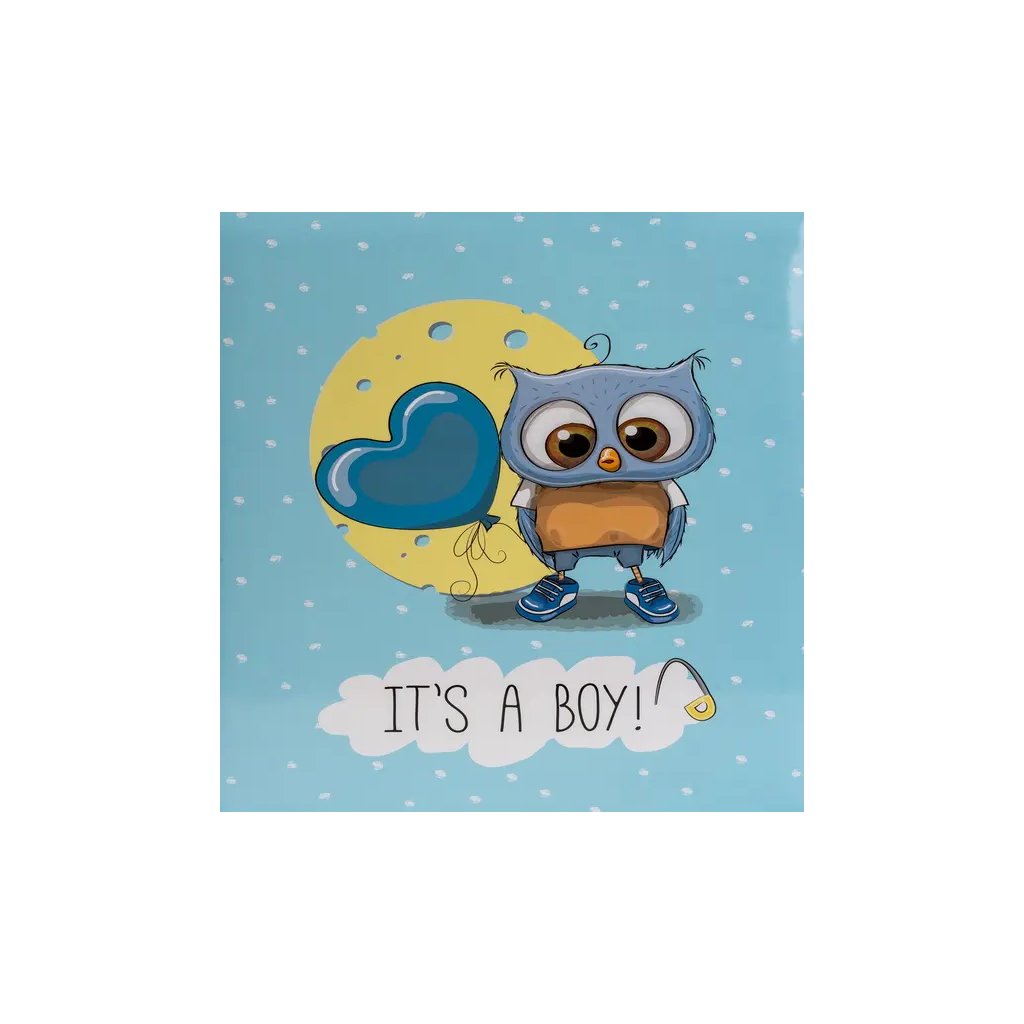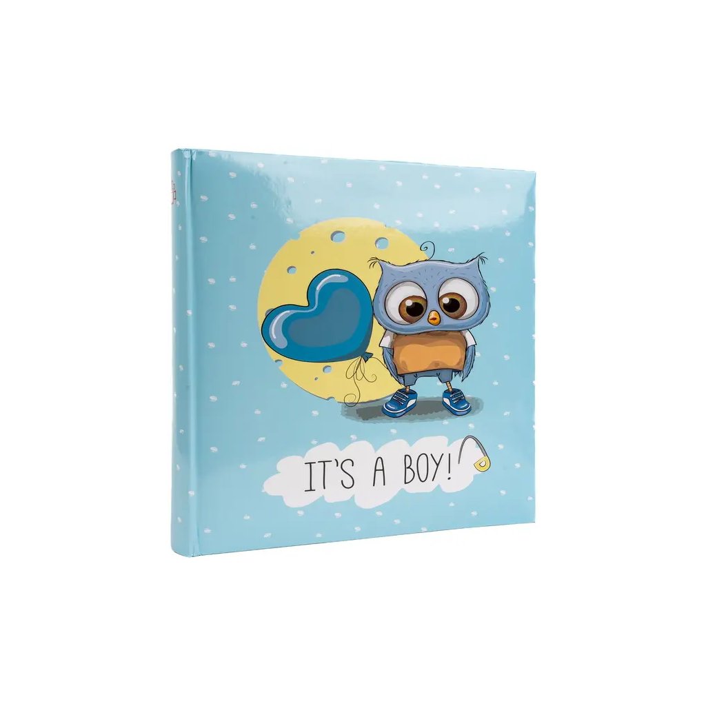 Jedná se o velké, dětské zasunovací fotoalbum s laminovanou obálkou v jasně modré barvě s bílými tečkami. Album má šitou vazbu ve formě knihy, což zaručuje jeho vysokou odolnost i při častém prohlížení. Je ideální pro uchování velkého množství vzpomínek, pojme až 500 fotografií formátu 10 x 15 cm, které se vkládají zasouváním (pět fotografií na jednu stránku – tři horizontálně a dvě vertikálně). Listy jsou vyrobeny z bílého papíru a album umožňuje popisky v postranní lince, čímž si můžete zaznamenat datum, váhu nebo jiné cenné vzpomínky ke každé fotografii. Na obálce je vyobrazen veselý dětský motiv s roztomilou sovičkou. Motiv je doplněn nápisem "IT'S A BOY!" (Je to kluk!) a bílými puntíky. Díky svému rozměru a specifickému designu je album ideální volbou pro uchování vzpomínek na první roky života chlapečka.Doplňkové parametry