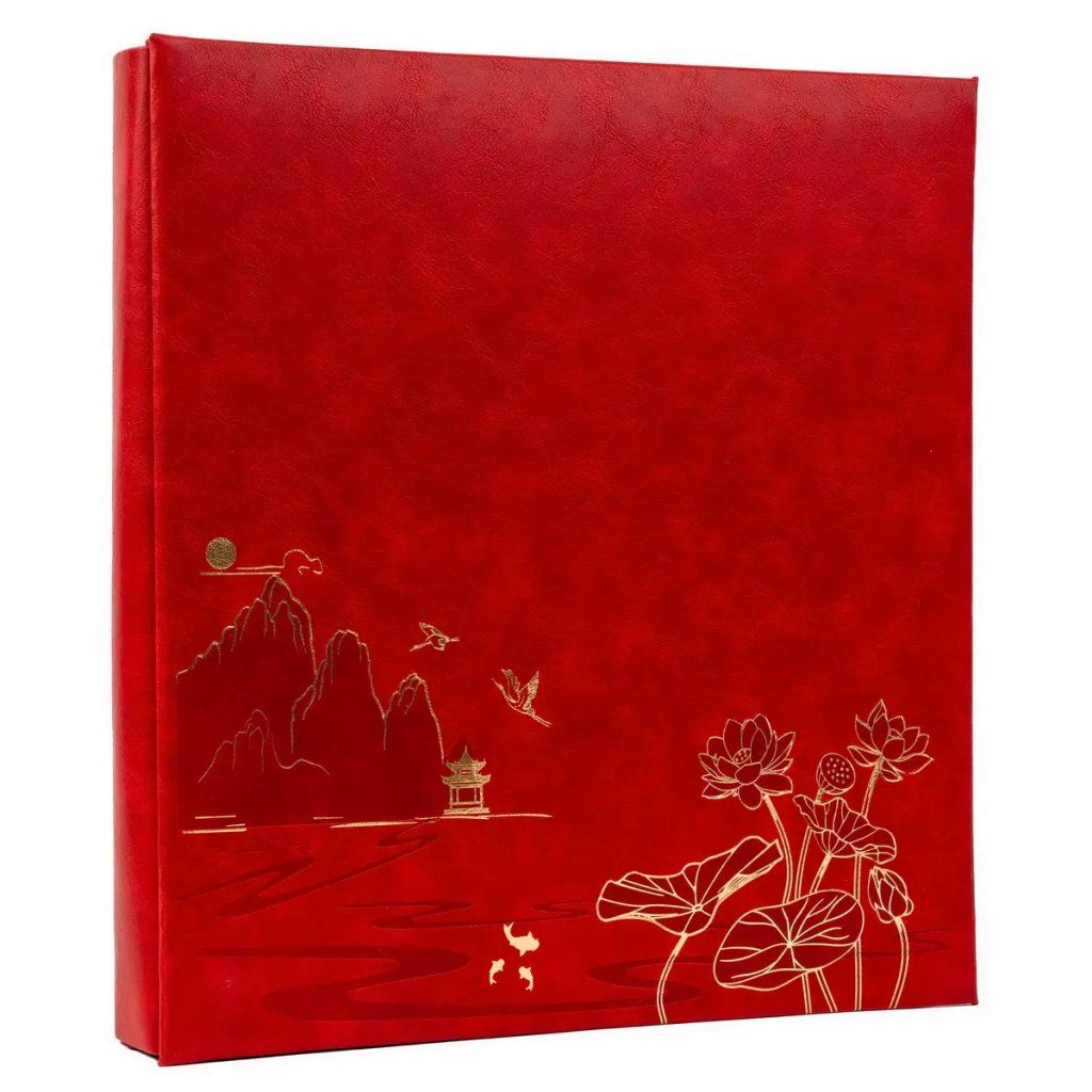 Toto velkoformátové zasunovací fotoalbum v elegantní zelené barvě zdobí jemný zlatý motiv lotosu a hor, který mu dodává luxusní vzhled. Album s nadstandardní kapacitou pro 500 fotografií formátu 10 x 15 cm disponuje celkovými rozměry 31,5 x 34 cm a je opatřeno pevnou šroubovanou (nýtovanou) vazbou. Obálka z kvalitní imitace kůže chrání vaše vzpomínky, zatímco vnitřní černé PVC/PP listy bez popisek nechávají barvy vašich snímků maximálně vyniknout.Doplňkové parametry