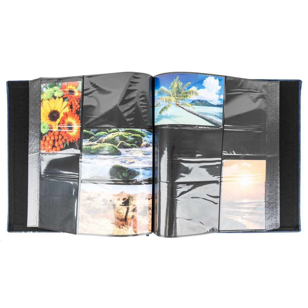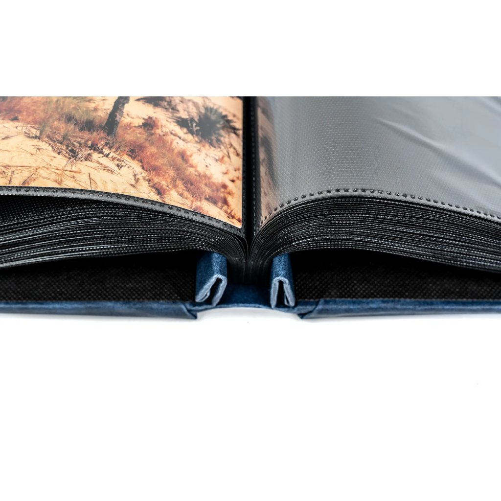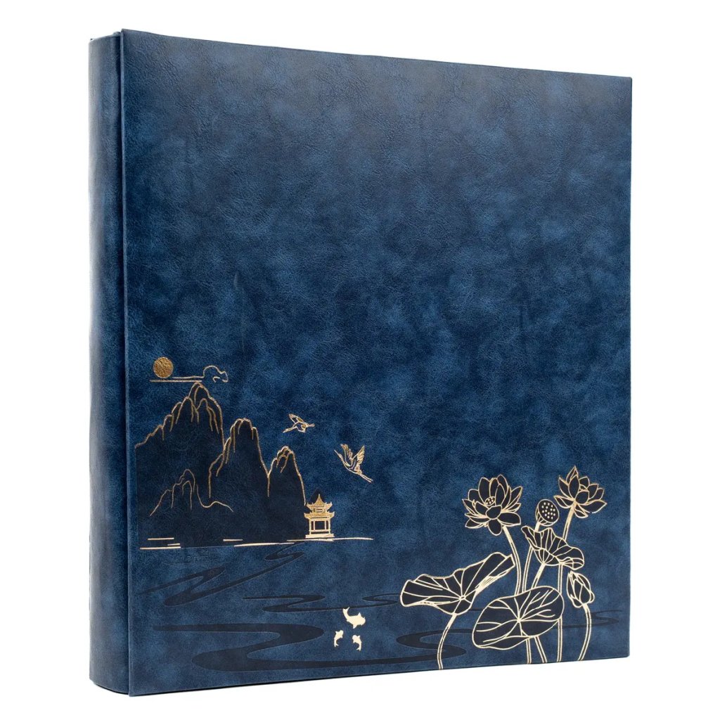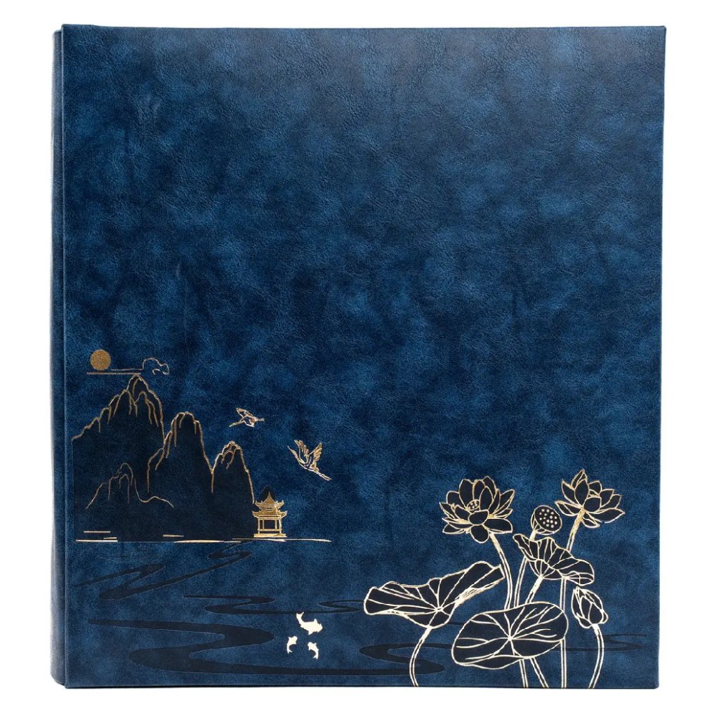 Toto velkoformátové zasunovací fotoalbum v hluboké modré barvě zdobí elegantní zlatý motiv lotosu a hor, který mu dodává luxusní a nadčasový vzhled. Album s mimořádnou kapacitou pro 500 fotografií formátu 10 x 15 cm má celkové rozměry 31,5 x 34 cm a je vybaveno velmi pevnou šroubovanou (nýtovanou) vazbou pro maximální odolnost. Obálka z kvalitní imitace kůže s jemnou texturou bezpečně chrání vaše snímky, zatímco vnitřní černé PVC/PP listy bez popisek zajišťují, že barvy vašich fotografií budou působit kontrastně a profesionálně.Doplňkové parametry