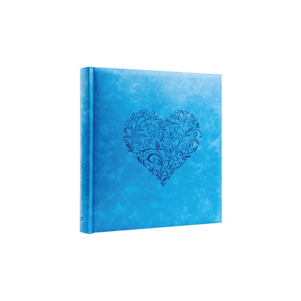Jedná se o klasické fotoalbum s deskami potaženými hladkou imitací kůže (koženkou) v zářivě modré barvě. Album má šitou vazbu ve formě knihy, což zaručuje jeho vysokou odolnost a dlouhou životnost. Je určeno pro 60 stran (30 listů) vyrobených z bílého/béžového papíru. Listy jsou odděleny jemnými pergamenovými mezilisty, které chrání fotografie před slepením a poškozením. Fotografie se do alba vlepují (za pomocí fotorůžků nebo lepidla), což umožňuje libovolné uspořádání a kombinování různých formátů. Na obálce je decentní ražba motivu stylizovaného srdce tvořeného propletenými florálními ornamenty a motýlem, který albu dodává elegantní a romantický vzhled. Díky svému rozměru a klasickému provedení je album ideální pro uchování velkého množství vzpomínek z důležitých událostí, jako jsou svatby, rodinné oslavy, výročí nebo cenné zážitky.Doplňkové parametry