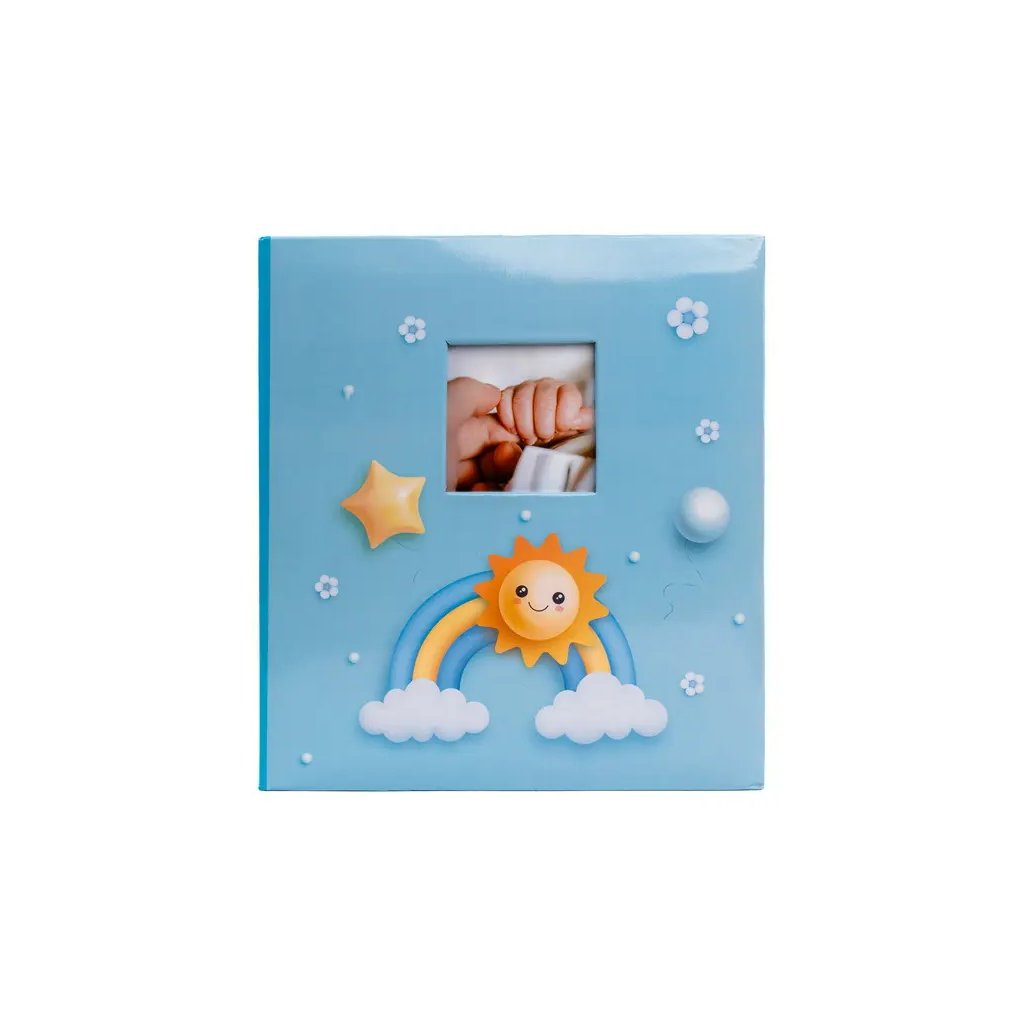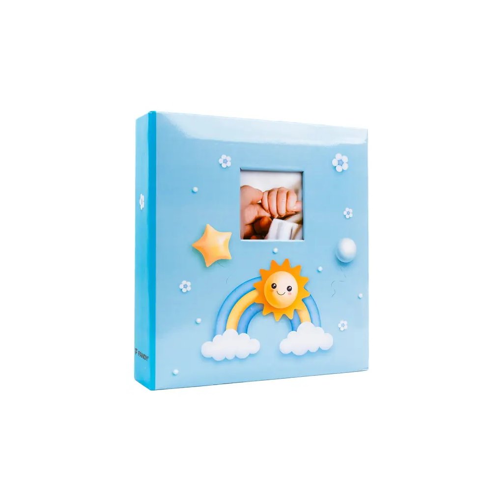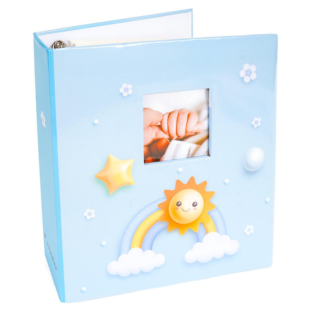 Uchovejte si vzpomínky na první roky života vašeho miminka v tomto krásném fotoalbu. Pevné desky z laminovaného papíru v modrém provedení a kroužková vazba zaručují odolnost a dlouhou životnost. Obal alba zdobí veselý motiv sluníčka, duhy a hvězdiček. Navíc má praktické okénko, do kterého lze vložit vlastní fotografii. Album obsahuje 100 samolepicích stran, na které je možné vkládat fotografie libovolného formátu.Doplňkové parametry