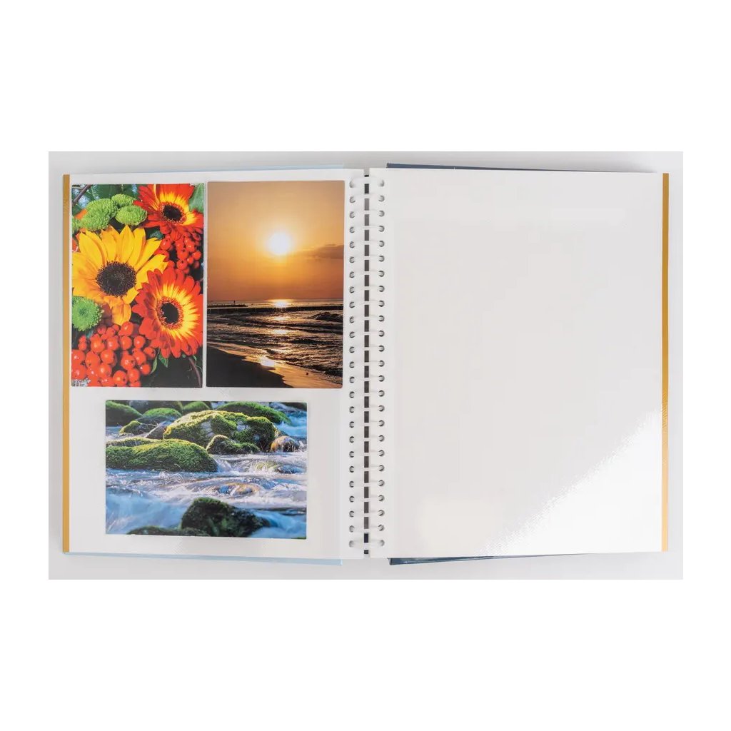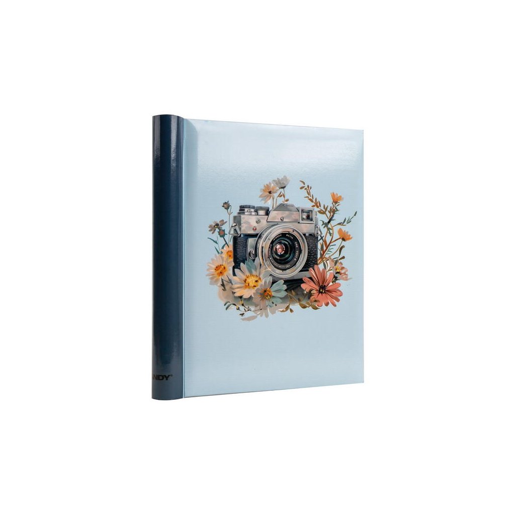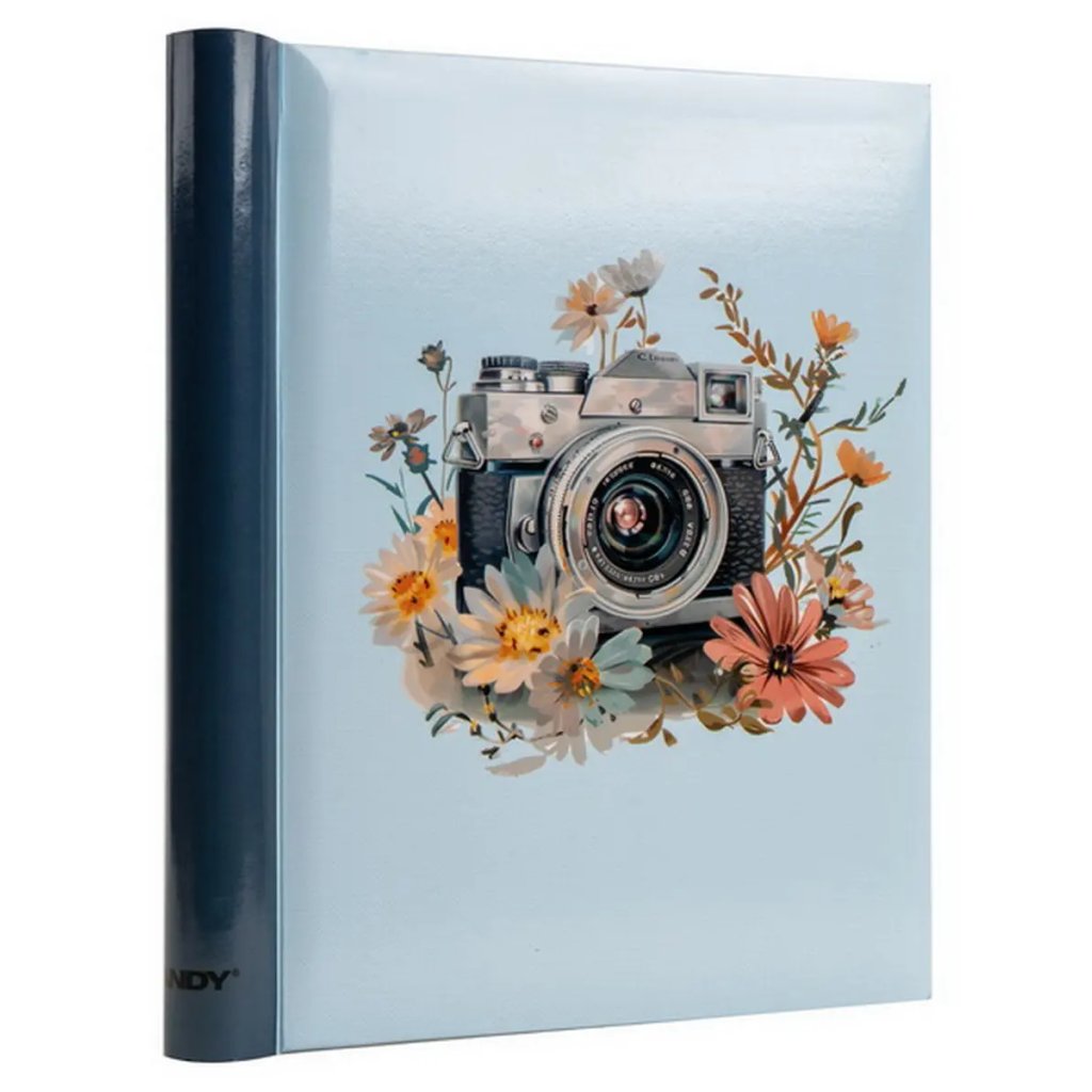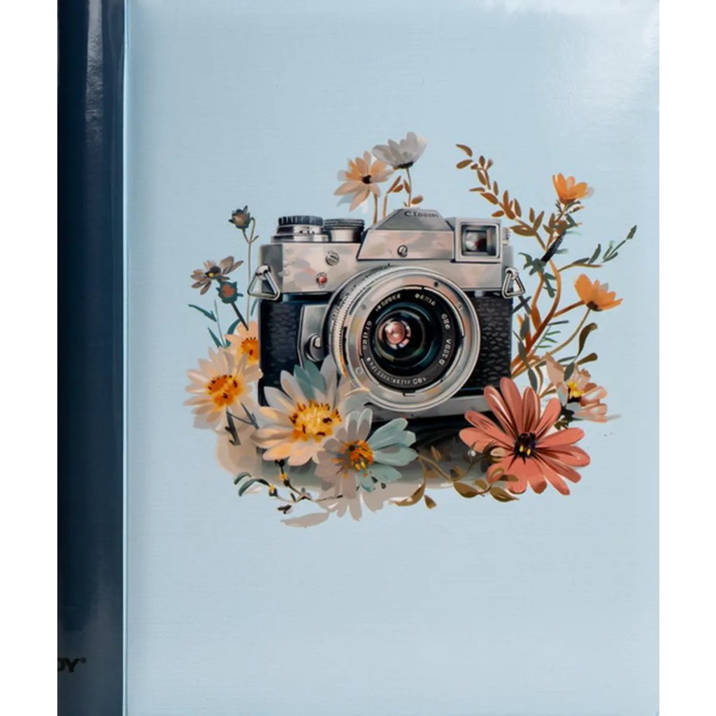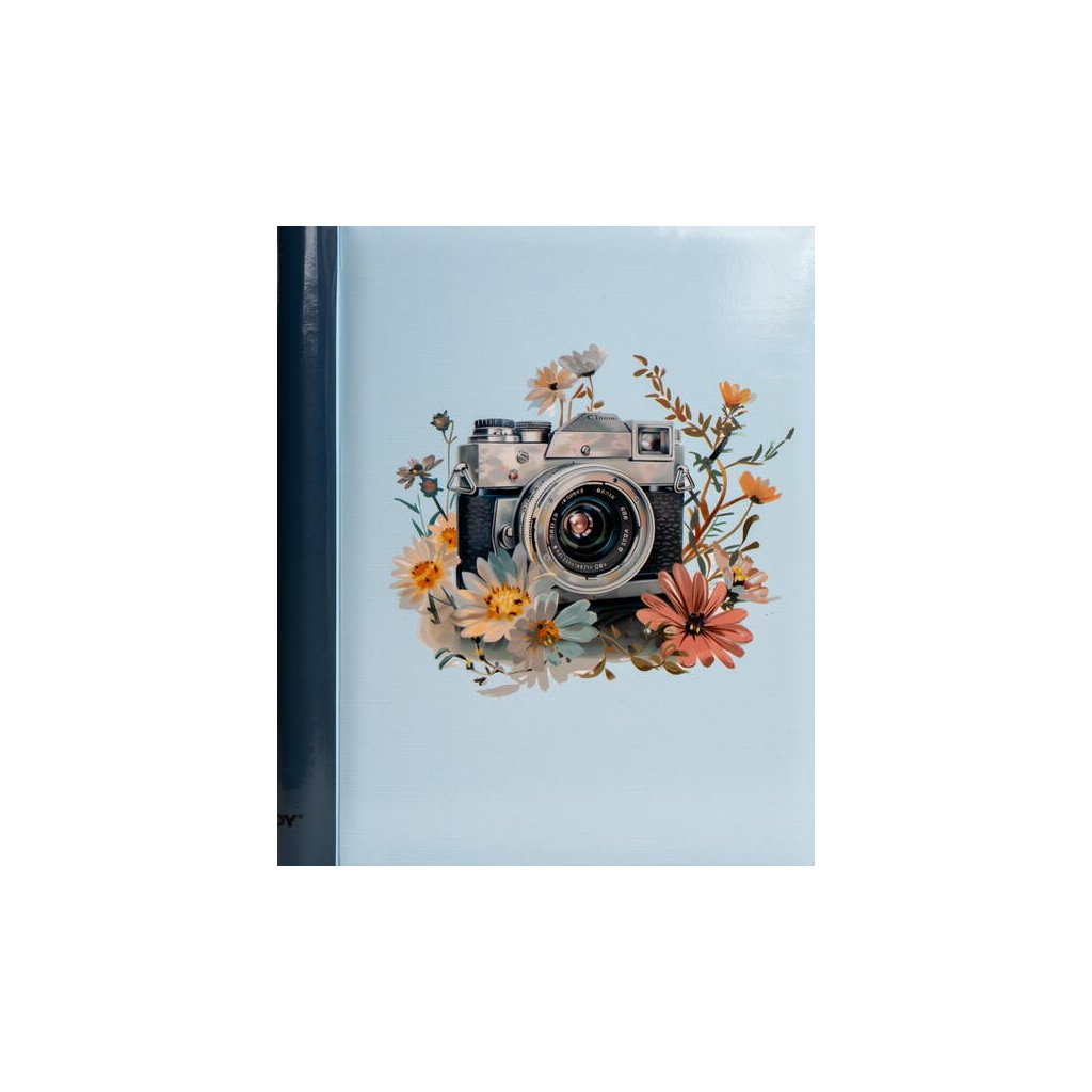 Jedná se o samolepicí fotoalbum s laminovanou obálkou ve světle modré barvě. Album má spirálovou vazbu, která umožňuje jeho jednoduché otáčení a rozevření do roviny. Je určeno pro 40 stran (20 listů) a je ideální pro různé formáty fotografií (maximální velikost fotografie 22,5 x 28 cm), které se lepí na bílé/béžové listy. Na obálce je vyobrazen retro motiv s detailní ilustrací starého fotoaparátu, obklopeného jemnými akvarelovými květy. Díky tomuto neutrálnímu a stylovému motivu je album ideální pro uchování vzpomínek z cest, přírody nebo jiných cenných zážitků.Doplňkové parametry