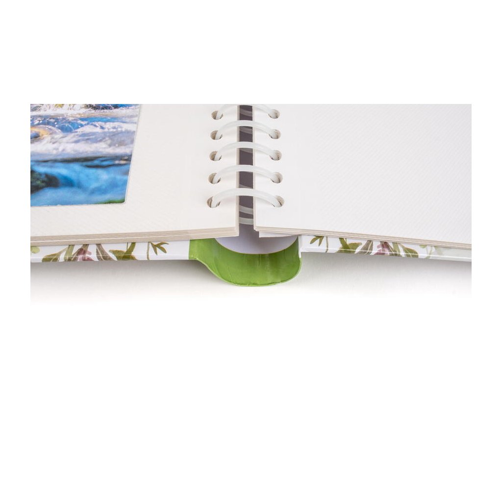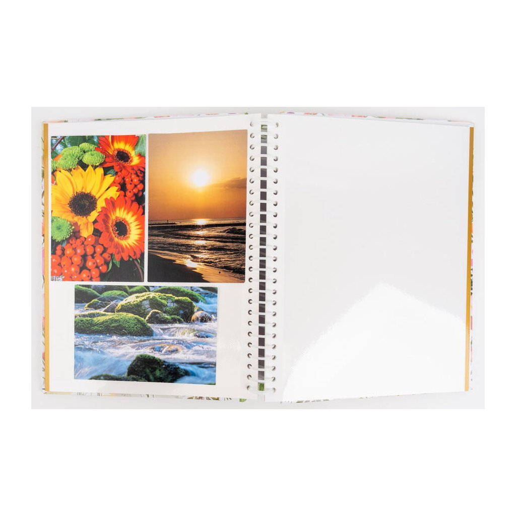Jedná se o samolepicí fotoalbum s laminovanou obálkou v zeleno-bílých barvách. Album má spirálovou vazbu, která umožňuje jeho jednoduché otáčení a rozevření do roviny. Je určeno pro 60 stran (30 listů) a je ideální pro různé formáty fotografií (maximální velikost fotografie 22,5 x 28 cm), které se lepí na bílé/béžové listy. Na obálce je vyobrazen romantický motiv tvořený věncem z jemných akvarelových květin v zelené barvě. Díky svému jemnému a elegantnímu designu je album ideální pro uchování vzpomínek na jarní a letní události, jako jsou dovolené, svatby, rodinné oslavy nebo jiné cenné zážitky.Doplňkové parametry