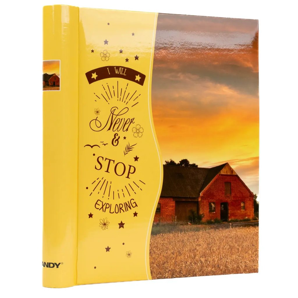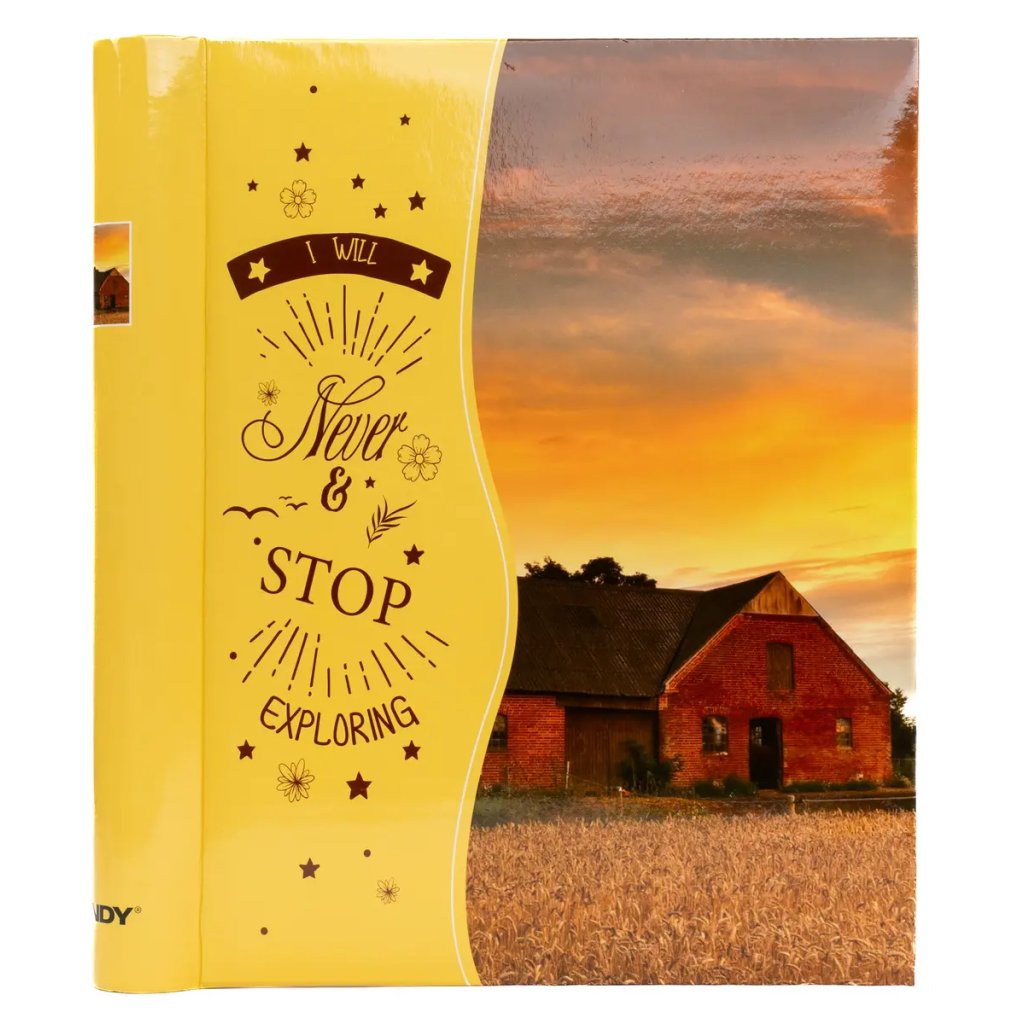 Zachyťte svoje dobrodružstvá v tomto inšpiratívnom albu s nápisom "I Will Never Stop Exploring". Teplá žlto-oranžová farebná paleta s krajinným motívom vytvorí dokonalý rámec pre vaše cestovateľské zážitky. Laminovaná obálka zabezpečuje odolnosť a špirálová väzba umožňuje jednoduché listovanie. Album ponúka 60 samolepiacich strán pre rýchle vkladanie fotografií. Ideálne pre cestovateľské spomienky alebo ako motivačný darček pre milovníkov dobrodružstv.Doplňkové parametry
