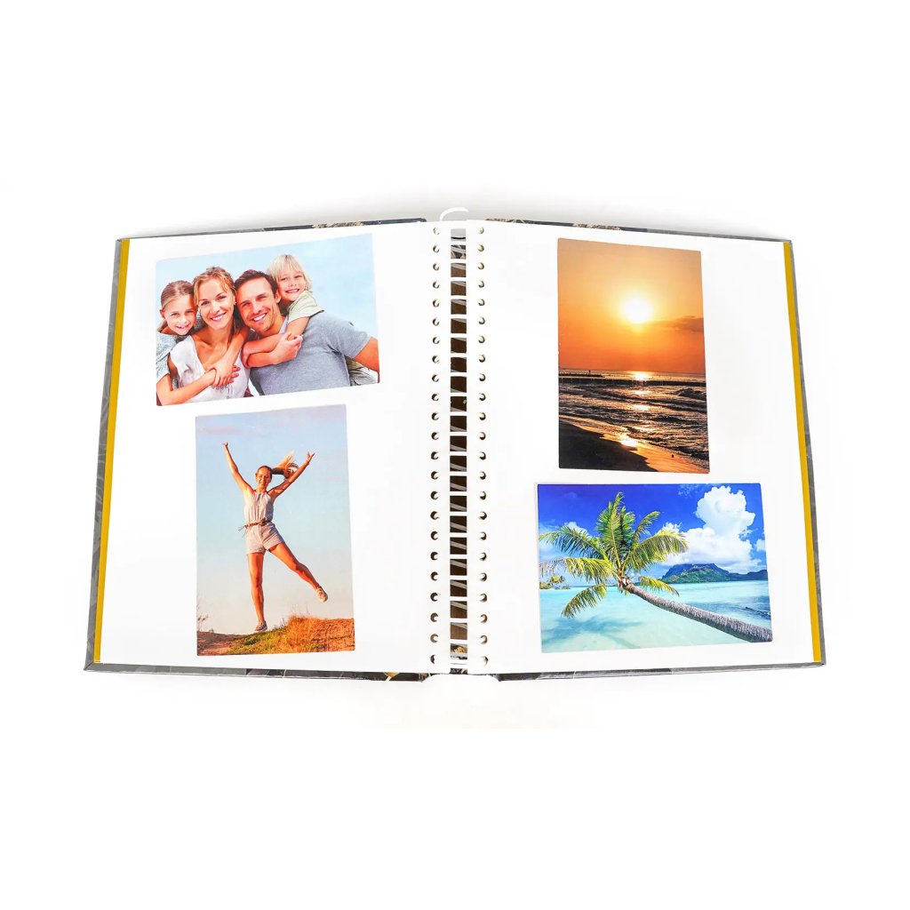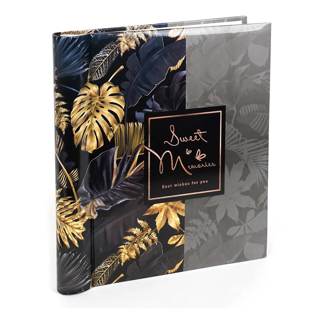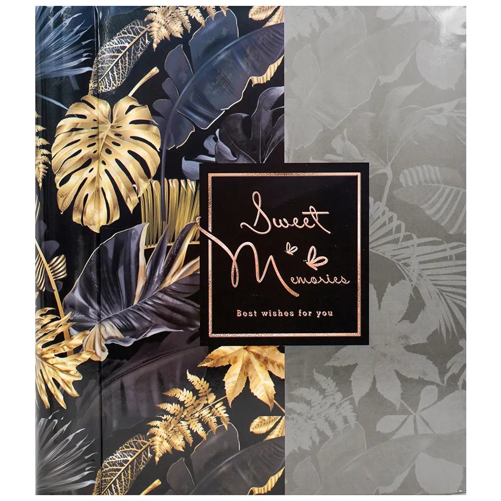 Zachyťte své vzácné okamžiky v tomto luxusním albu s exotickým botanickým vzorem. Sofistikovaný design se zlatými tropickými listy na černo-šedém podkladu s nápisem "Sweet Memories" dodá vašim fotografiím elegantní a tajemný nádech. Laminovaná obálka zaručuje dlouhou životnost a spirálová vazba poskytuje pohodlné používání. Album obsahuje 60 samolepicích stran. Perfektní pro výjimečné příležitosti nebo jako prémiový dárek.Doplňkové parametry