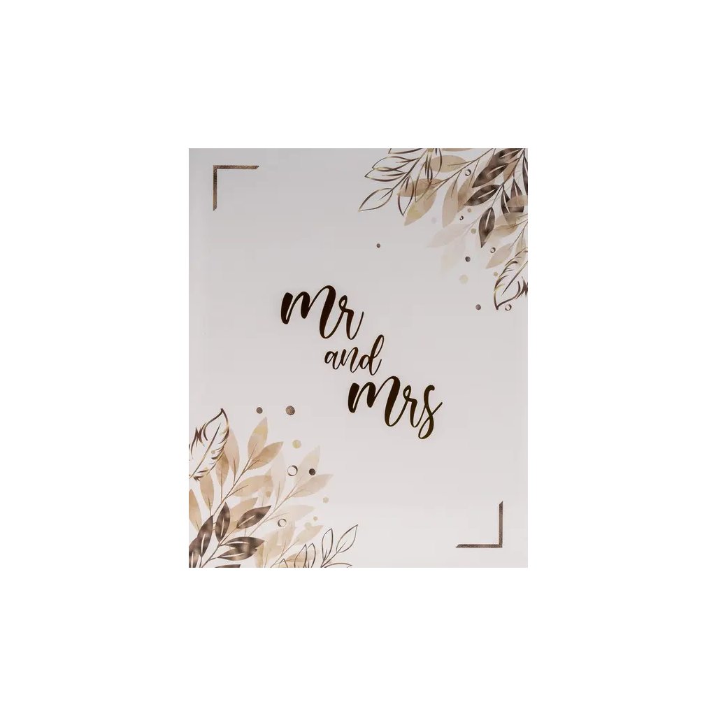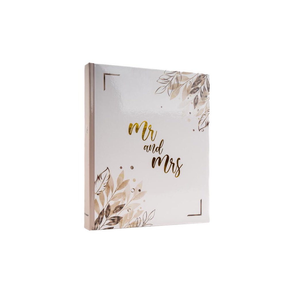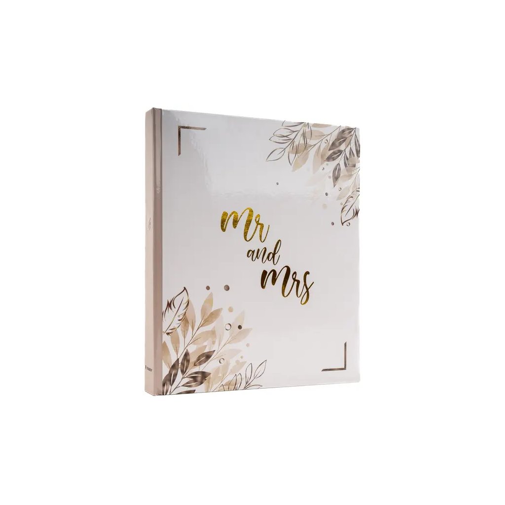 Uchovejte si vzpomínky na váš svatební den v tomto elegantním fotoalbu. Pevné desky z laminovaného papíru a šitá vazba zaručují odolnost a dlouhou životnost. Obal alba zdobí zlatý nápis "Mr and Mrs" a motiv listů v odstínech béžové a hnědé barvy. Album obsahuje 40 samolepicích stran, na které je možné vkládat fotografie libovolného formátu.Doplňkové parametry