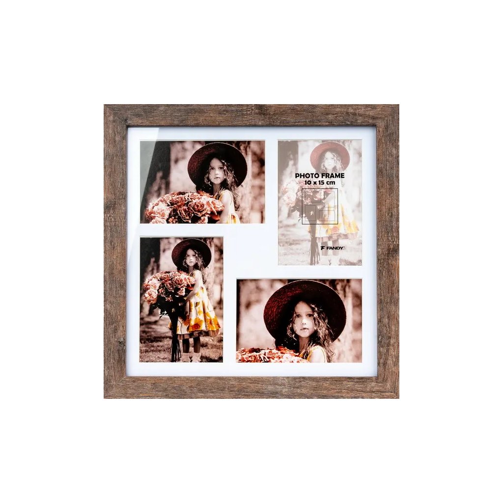 Vzpomínejte na své nejkrásnější okamžiky s tímto fotorámečkem Narvik Gallery v dekoru dřeva. Hnědý MDF rámeček ve vintage stylu je ideální na čtyři fotografie – dvě fotografie o rozměrech 10 x 15 cm a dvě fotografie o rozměrech 15 x 10 cm. Bez pasparty je do rámečku možné vložit jednu fotografii o rozměrech 30 x 30 cm. Celý rámeček má rozměr 35 x 35 cm, přičemž šířka lišty je 2,8 cm. Rámeček je určen k zavěšení na zeď vertikálně. Fotografie jsou chráněny sklem a do rámečku se vkládají jednoduše ze zadní strany.Doplňkové parametry