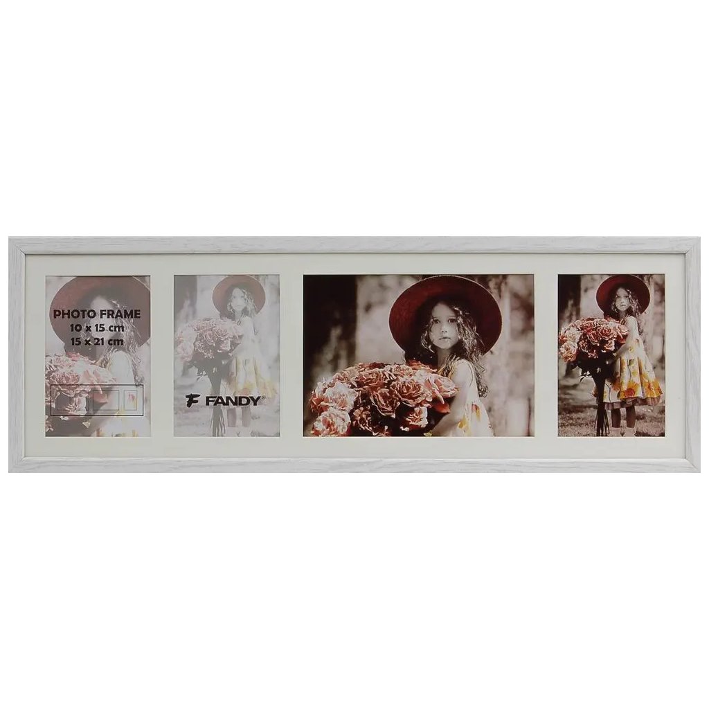 Vzpomínejte na své nejkrásnější okamžiky s tímto fotorámečkem Style Gallery v dekoru dřeva. Bílý MDF rámeček je ideální na čtyři fotografie – tři fotografie o rozměrech 10 x 15 cm a jednu fotografii o rozměrech 15 x 21 cm. Bez pasparty je do rámečku možné vložit jednu fotografii o rozměrech 59 x 18 cm. Celý rámeček má rozměr 61,5 x 21 cm, přičemž šířka lišty je 1,5 cm. Rámeček je určen k zavěšení na zeď vertikálně i horizontálně. Fotografie jsou chráněny sklem a do rámečku se vkládají jednoduše ze zadní strany.Doplňkové parametry