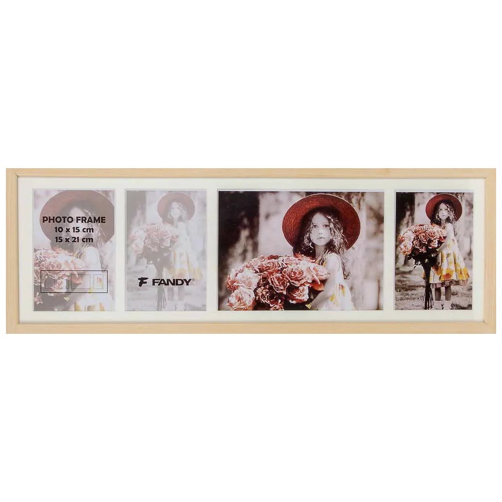 Vzpomínejte na své nejkrásnější okamžiky s tímto fotorámečkem Style Gallery v dekoru dřeva. Světle hnědý MDF rámeček je ideální na čtyři fotografie – tři fotografie o rozměrech 10 x 15 cm a jednu fotografii o rozměrech 15 x 21 cm. Bez pasparty je do rámečku možné vložit jednu fotografii o rozměrech 59 x 18 cm. Celý rámeček má rozměr 61,5 x 21 cm, přičemž šířka lišty je 1,5 cm. Rámeček je určen k zavěšení na zeď vertikálně i horizontálně. Fotografie jsou chráněny sklem a do rámečku se vkládají jednoduše ze zadní strany.Doplňkové parametry
