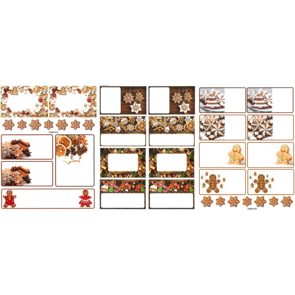 Tyto samolepicí jmenovky jsou skvělým doplňkem pro balení vánočních dárků. Balení obsahuje 3 archy s jmenovkami, přičemž každý arch má rozměr 15 x 19 cm. Samolepky mají krásné vánoční motivy, jako jsou perníčky, koření a vánoční dekorace, které dodají dárkům slavnostní a hřejivý vzhled. Jsou ideální pro snadné a rychlé označení dárků.Doplňkové parametry