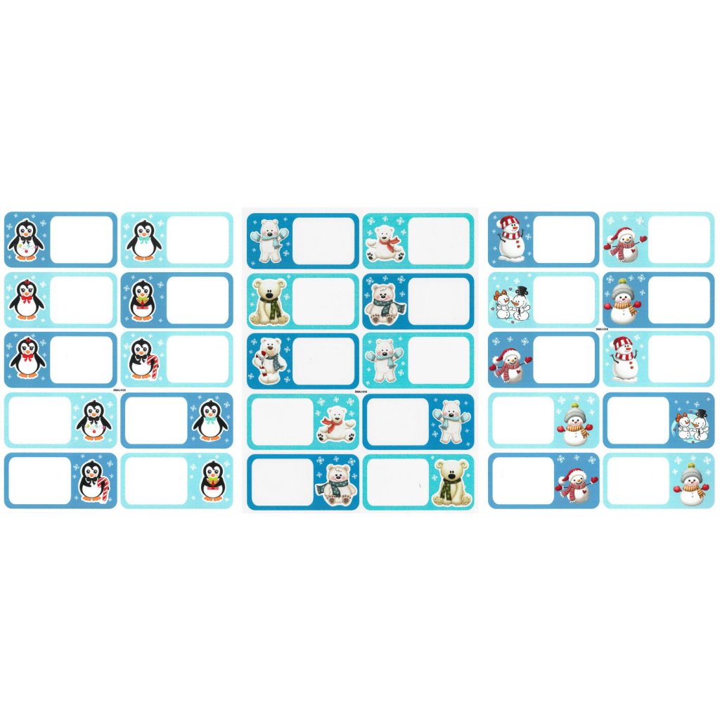 Tyto samolepicí jmenovky jsou skvělým doplňkem pro balení vánočních dárků. Balení obsahuje 3 archy s jmenovkami, přičemž každý arch má rozměr 15 x 19 cm. Samolepky mají hravé zimní a vánoční motivy, jako jsou tučňáci, polární medvědi a sněhuláci, které dodají dárkům veselý a roztomilý vzhled. Jsou ideální pro snadné a rychlé označení dárků.Doplňkové parametry