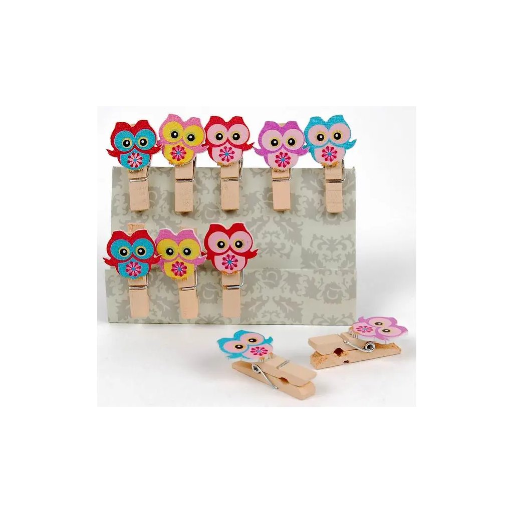 Jedná se o balení 10 kusů dekoračních kolíčků s motivem soviček. Kolíčky jsou vyrobeny z přírodního materiálu v motivu dřeva a mají aplikaci soviček v různých barvách. Rozměr kolíčku je 0,7 x 3,5 cm s tloušťkou 1 cm. Kolíčky se dají využít k zavěšení fotografií, poznámek nebo jako ozdoba na dárky a dekorace.Doplňkové parametry