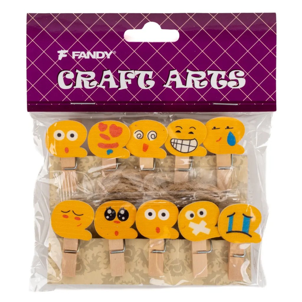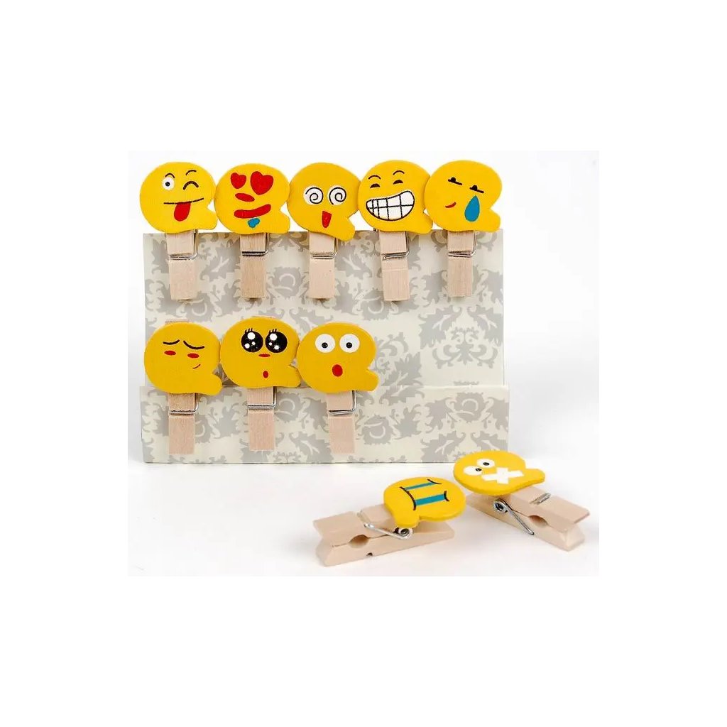 Sada 10 kusů dekorativních dřevěných kolíčků s emoji motivy s rozměry 0,7 x 3,5 cm a tloušťkou 1 cm. Každý kolíček je vyroben z přírodního béžového dřeva a ozdoben žlutou aplikací s různými emoji výrazy jako jsou usměvavý, zamilovaný, překvapený, plačící nebo unavený. Kolíčky jsou ideální na dětské oslavy, připevňování fotografií, vtipné vzkazy nebo oživení každodenních dekorací. Kombinace přírodních materiálů s veselými emoji motivy vytváří hravý doplněk pro každou příležitost plnou humoru a radosti.Doplňkové parametry
