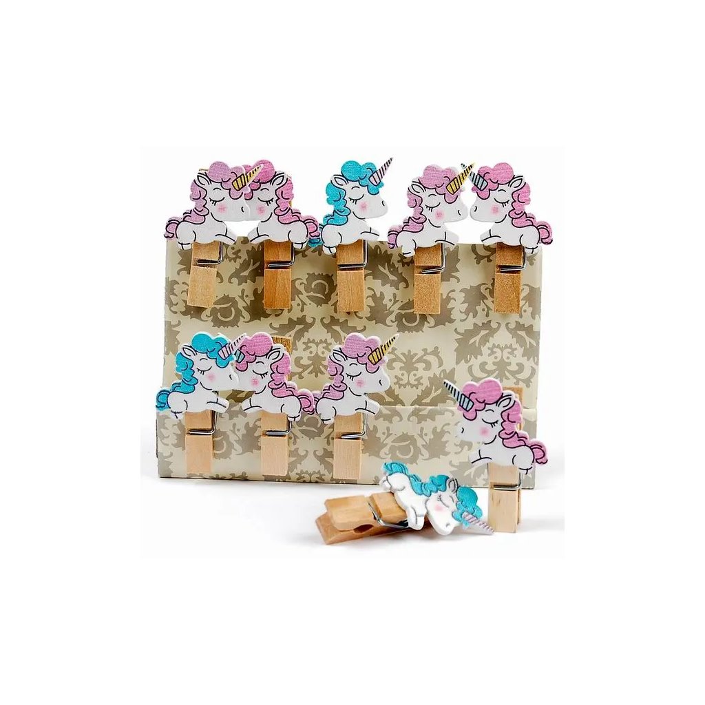 Sada 10 kusů dekorativních dřevěných kolíčků s jednorožci s rozměry 0,7 x 3,5 cm a tloušťkou 1 cm. Každý kolíček je vyroben z přírodního béžového dřeva a ozdoben barevnou aplikací s roztomilými jednorožci v růžových, fialových a tyrkysových odstínech s bílými tělíčky a třpytivými detaily. Kolíčky jsou ideální na dětské oslavy, připevňování fotografií, pohádkové dekorace nebo oživení každodenních projektů. Kombinace přírodních materiálů s magickými jednorožci vytváří kouzelný doplněk pro každou příležitost plnou fantazie a dětských snů.Doplňkové parametry