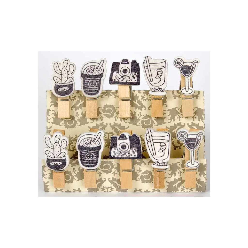 Sada 10 kusů dekorativních dřevěných kolíčků s vintage motivy s rozměry 0,7 x 3,5 cm a tloušťkou 1 cm. Každý kolíček je vyroben z přírodního béžového dřeva a ozdoben aplikací s retro motivy v černobílém stylu jako jsou kávové šálky, fotoaparát, koktejlové sklenice a stylové nápoje. Kolíčky jsou ideální na vintage oslavy, připevňování fotografií, retro dekorace nebo tematické projekty. Kombinace přírodních materiálů s nostalgickými motivy vytváří stylový doplněk s kouzlem minulých časů.Doplňkové parametry