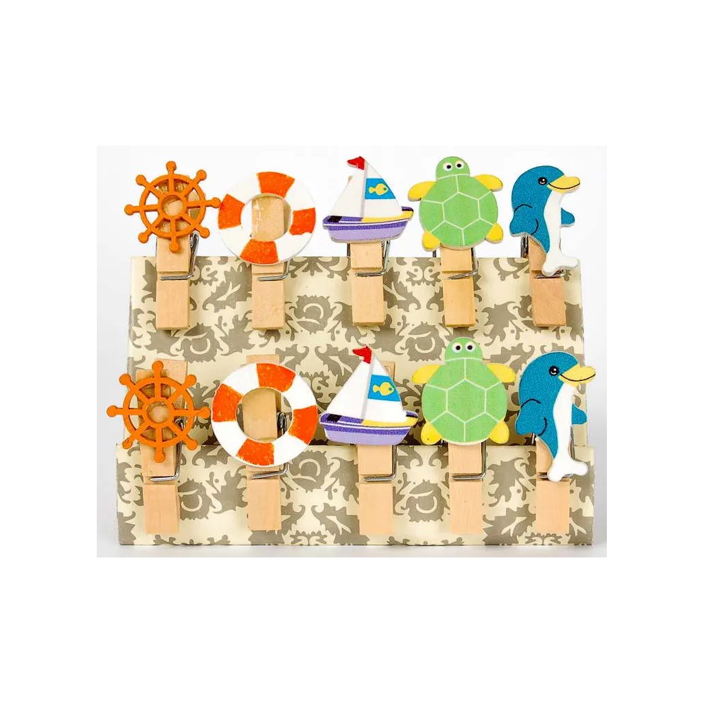 Sada 10 kusů dekorativních dřevěných kolíčků s mořskými motivy s rozměry 0,7 x 3,5 cm a tloušťkou 1 cm. Každý kolíček je vyroben z přírodního béžového dřeva a ozdoben barevnou aplikací s námořními motivy jako jsou kormidlo, majáky, lodičky, želvy a tučňáci. Kolíčky jsou ideální na letní oslavy, připevňování fotografií nebo námořní dekorace. Kombinace přírodních materiálů s mořskými motivy vytváří hravý doplněk plný letní atmosféryDoplňkové parametry