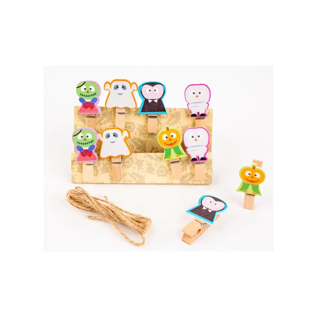Jedná se o sadu 10 dekoračních kolíčků s veselým Halloweenským motivem strašidel. Kolíčky jsou vyrobeny z přírodního dřeva a jsou osazeny aplikacemi z filcu/měkkého materiálu s třpytivým glitrovým lakem. V balení naleznete mix motivů, jako je zombie, duch, upír, dýně a sova/přízrak. Kolíčky jsou ideální pro dekoraci do interiéru, zavěšení drobných vzkazů, fotek nebo jako doplněk k dárkovým balením. Díky přiloženému jutovému provázku je lze použít i k vytvoření Halloweenské girlandy. Kolíčky mají rozměry 3,5 cm na délku.Doplňkové parametry