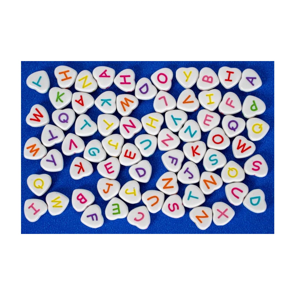 Tyto dekorační korálky ve tvaru srdce s písmeny jsou skvělým doplňkem pro kreativní tvoření. Bílé korálky s pastelovými písmeny mají velikost 10 mm a jsou ideální pro navlékání náramků, náhrdelníků nebo pro zdobení přání, krabiček a dalších projektů. Balení obsahuje 30 g korálků.Doplňkové parametry