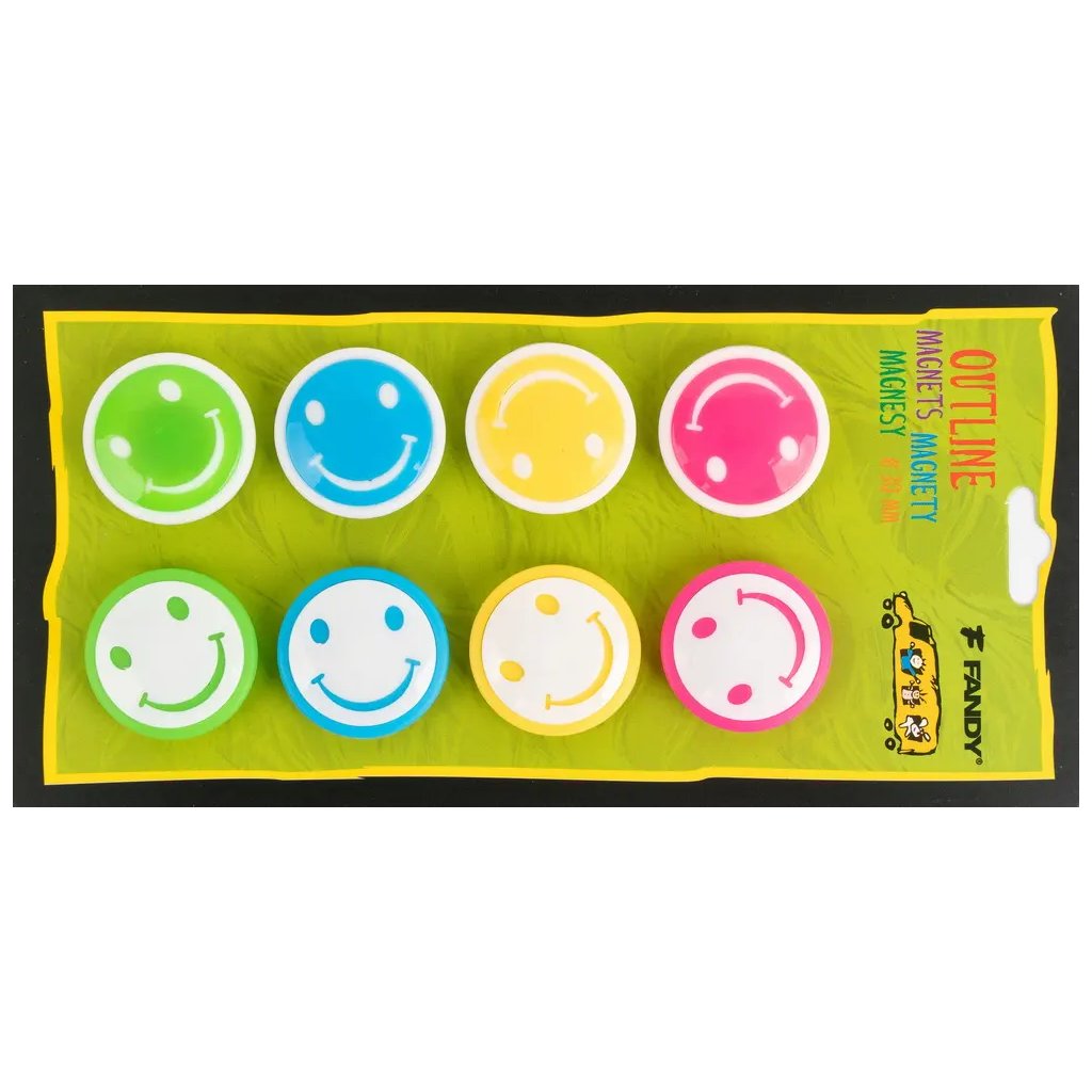 Tato pozitivní sada 8 kusů magnetů s motivem usměvavých emotikonů vnese dobrou náladu na každou magnetickou tabuli, nástěnku nebo lednici. Magnety o průměru 3 cm zaujmou svým hravým designem, který kombinuje zářivé barvy s bílými detaily. V balení naleznete mix čtyř barev – zelené, modré, žluté a růžové, přičemž každá barva je zastoupena ve dvou variantách: barevný obličej s bílým úsměvem a bílý obličej s barevným úsměvem. Tyto kulaté magnety jsou nejen praktickým pomocníkem pro uchycení poznámek, fotografií či dětských výtvorů, ale také stylovou dekorací, která rozzáří každé pracovní i studijní místo.Doplňkové parametry