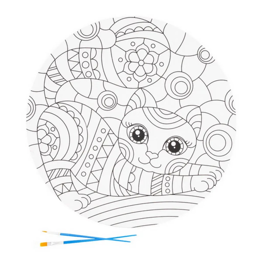 Jedná se o originální omalovánku na plátně v kulatém tvaru s detailním motivem roztomilé, stylizované kočky. Omalovánka je připravena k vybarvení podle vlastní fantazie, ať už akrylovými, temperovými nebo jinými barvami, a vytvoříte tak jedinečnou dekoraci do pokoje. Součástí sady jsou i dva štětce. Rozměr je cca 39 x 39 cm.Doplňkové parametry