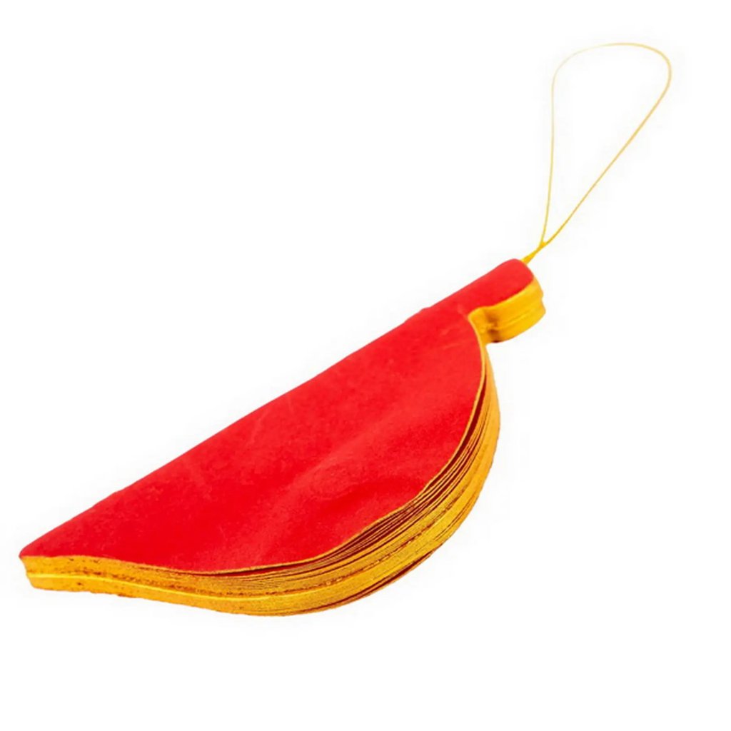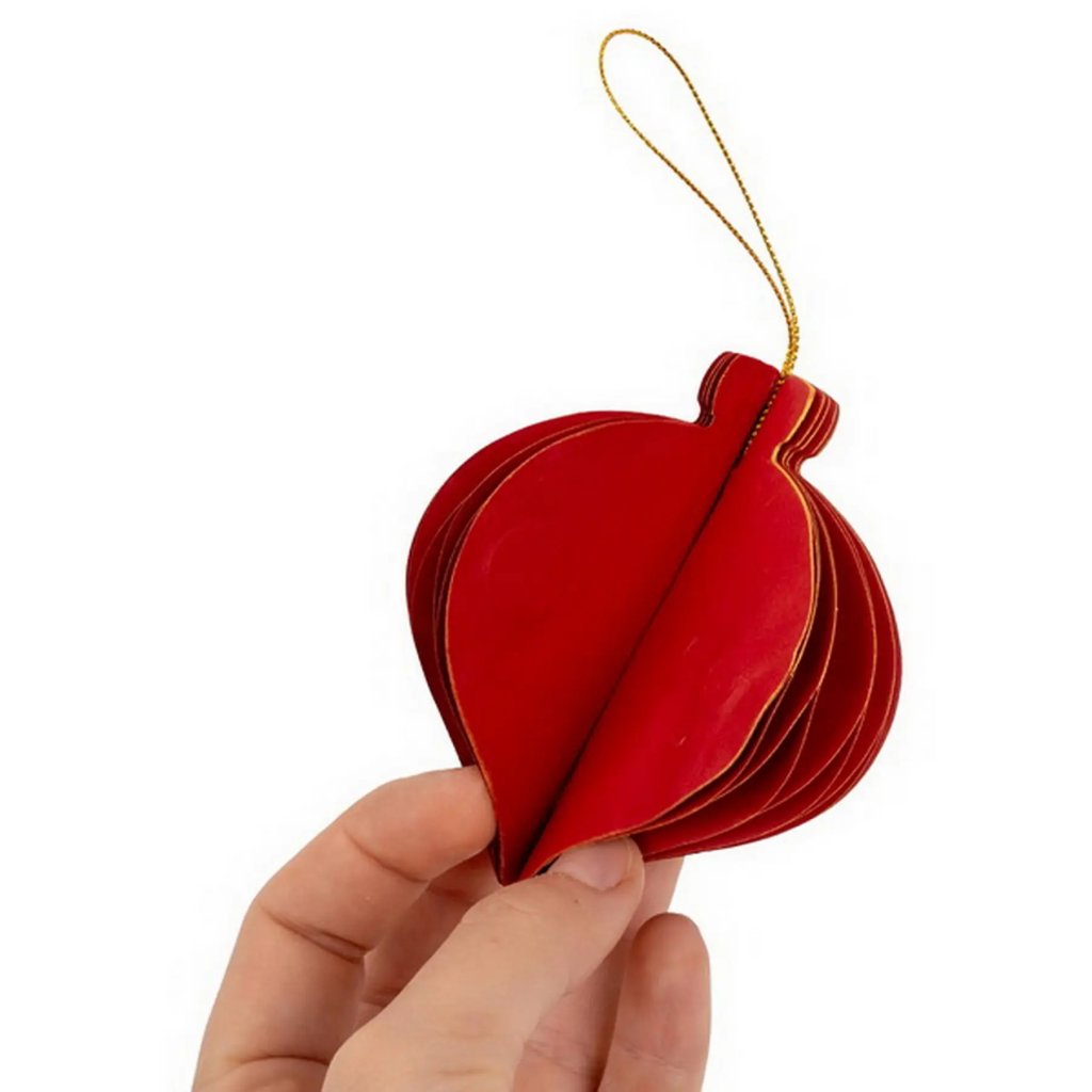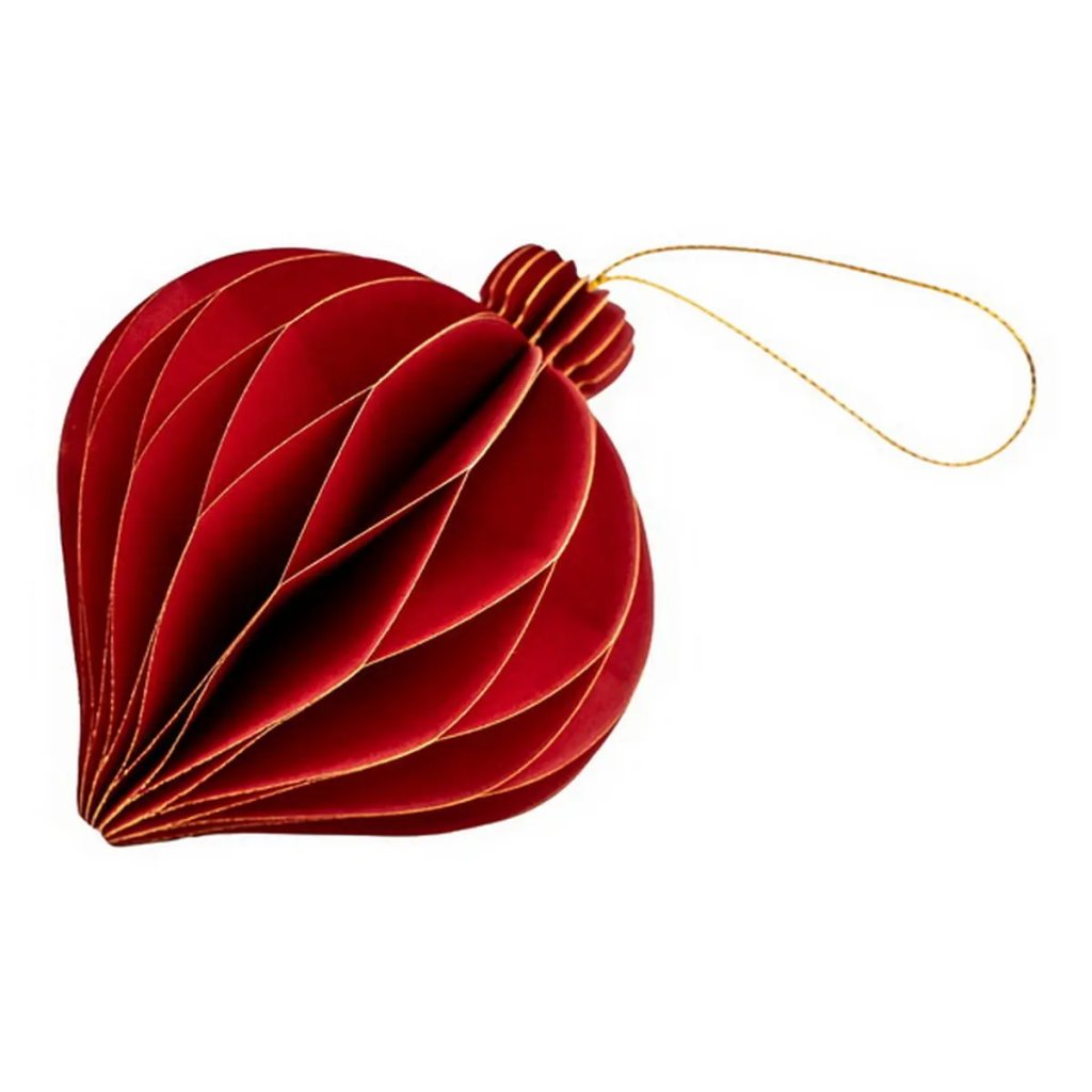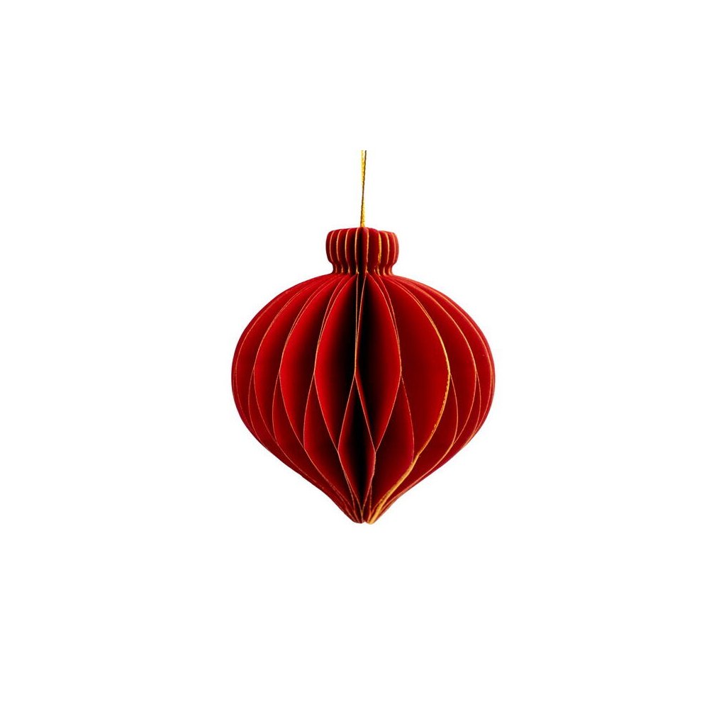 Jedná se o papírovou dekorační ozdobu ve tvaru podlouhlé vánoční koule. Ozdoba má skládanou (harmonikovou) konstrukci, která po rozložení vytvoří trojrozměrný tvar. Po složení drží ozdoba pohromadě pomocí magnetu. Je vyvedena v elegantní tmavě červené barvě se zlatými okraji a je ideální pro zavěšení. Velikost ozdoby je cca 9 cm.Doplňkové parametry