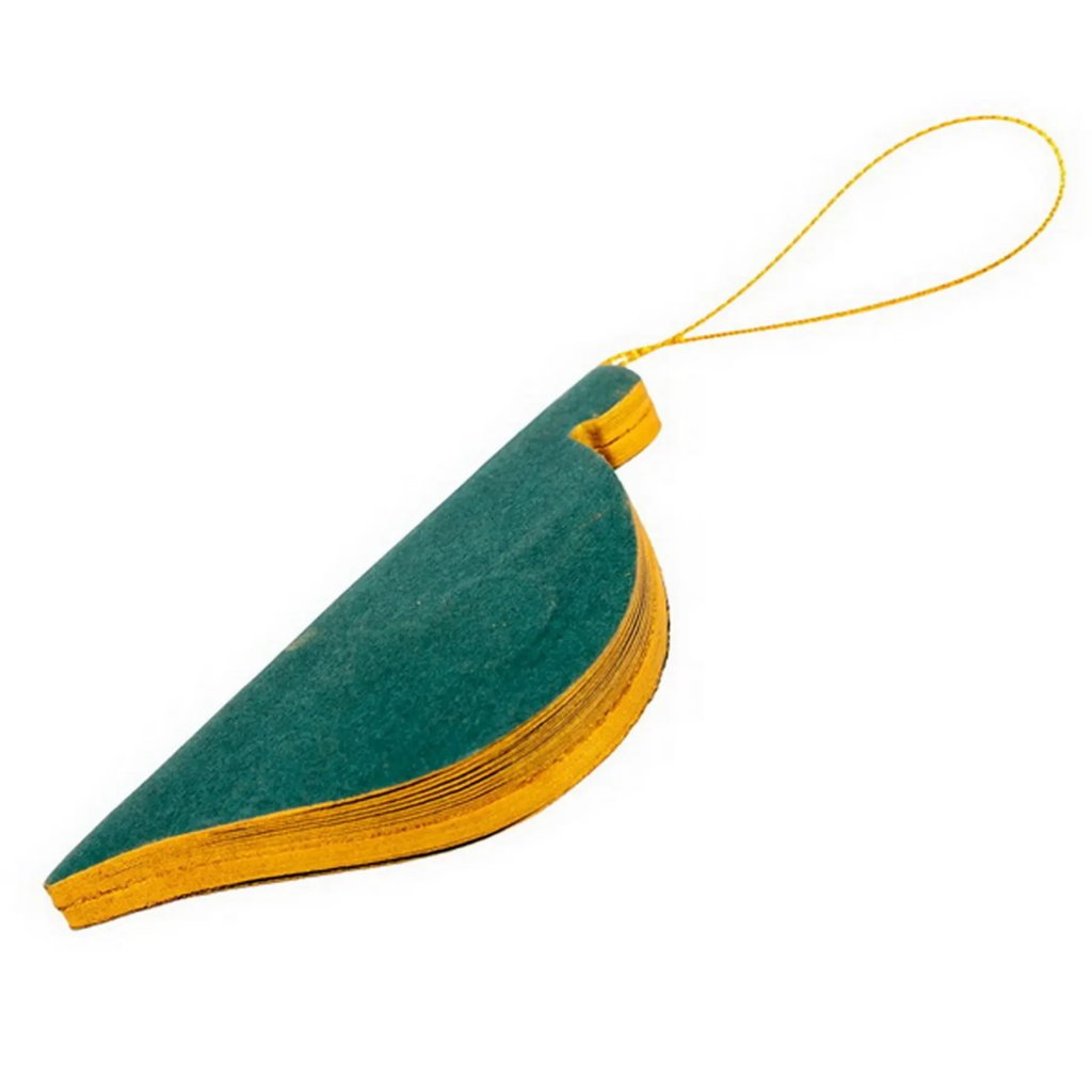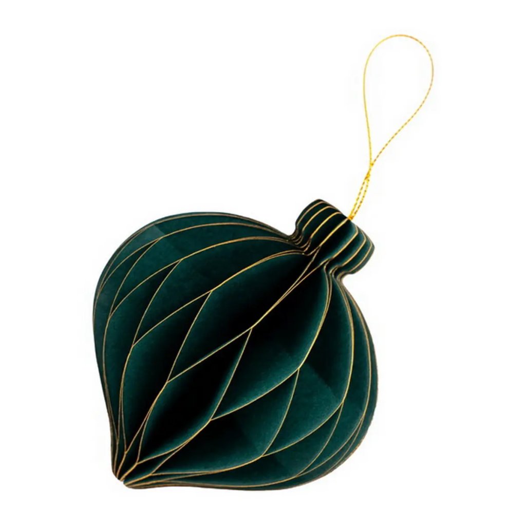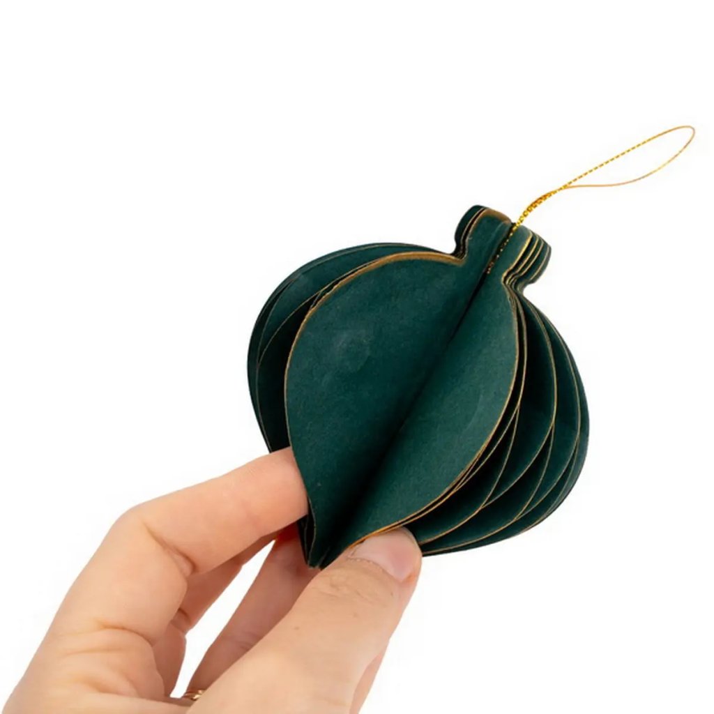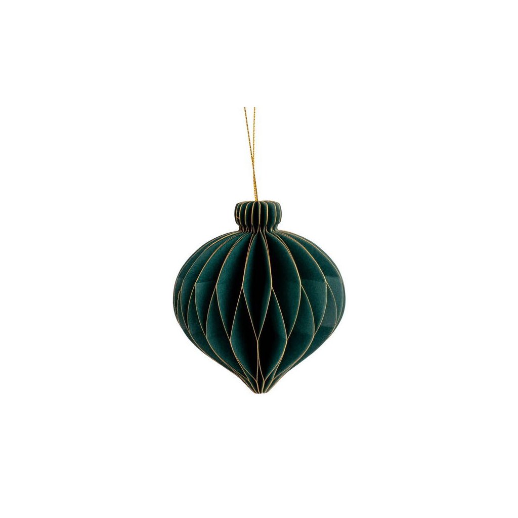 Jedná se o papírovou dekorační ozdobu ve tvaru podlouhlé vánoční koule. Ozdoba má skládanou (harmonikovou) konstrukci, která po rozložení vytvoří trojrozměrný tvar. Po složení drží ozdoba pohromadě pomocí magnetu. Je vyvedena v elegantní zelené barvě se zlatými okraji a je ideální pro zavěšení. Velikost ozdoby je cca 9 cm.Doplňkové parametry