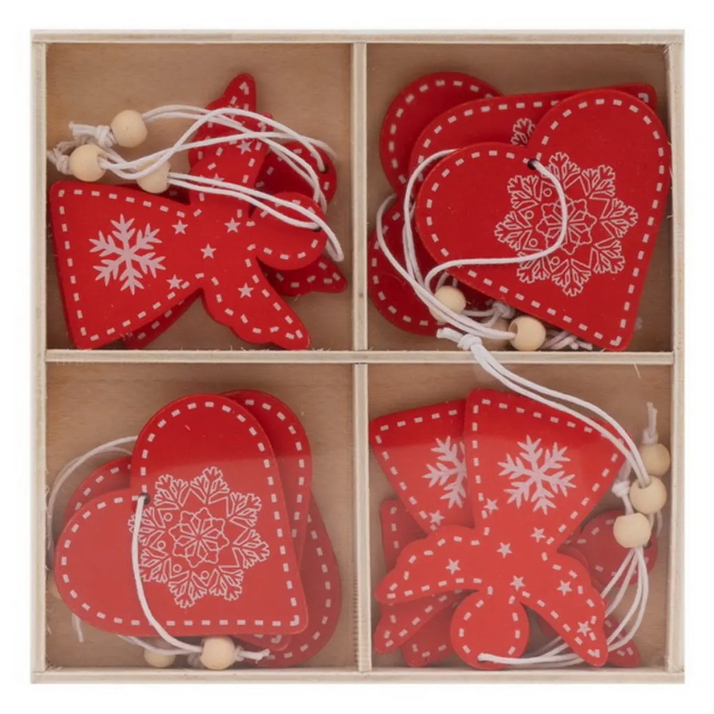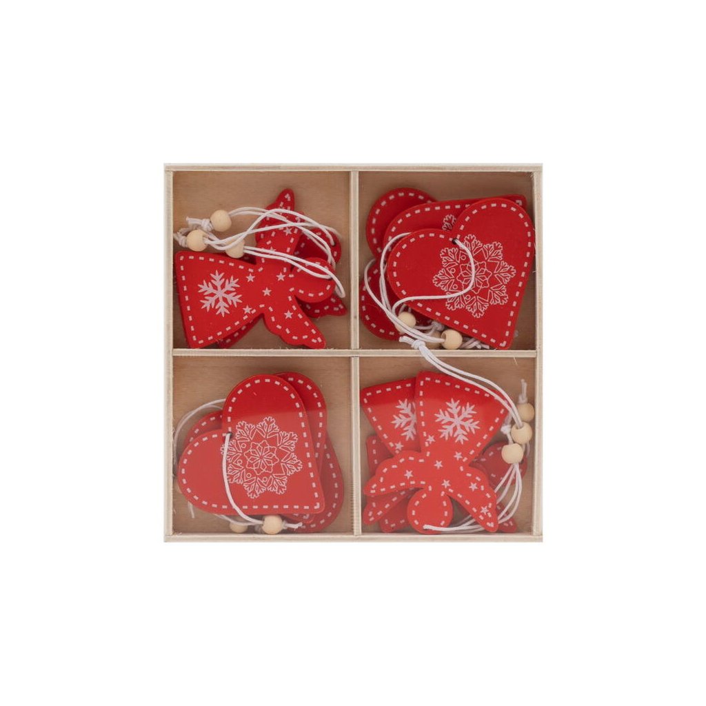 Jedná se o sadu 12 ks dřevěných dekoračních ozdob v krabičce, navrženou k okamžitému zavěšení i k vlastnímu dotvoření. Dekorace mají tvar srdcí a andělů, obě varianty v tradiční červené barvě s bílým lemem a detaily sněhových vloček. Každá ozdoba je doplněna dřevěnými korálky a provázkem pro zavěšení. Každá dekorace má velikost cca 5,5 cm. Ozdoby jsou uloženy v dřevěné krabičce rozdělené na čtyři sekce, krabička má rozměry 13,8 x 13,8 cm. Sada je ideální pro ozdobení vánočního stromku, adventních věnců nebo jako originální dárek.Doplňkové parametry