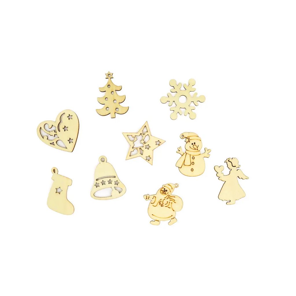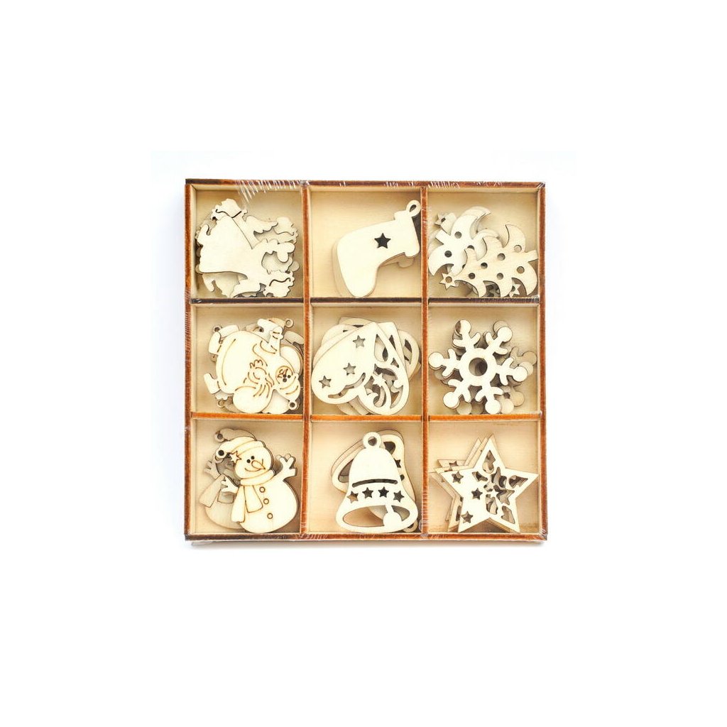 Jedná se o sadu 45 dřevěných dekorací s vánočním motivem, které jsou uloženy v krabičce. Velikost jednotlivých ozdob se pohybuje od 2,5 do 3,5 cm. Dekorace jsou ideální pro kreativní tvoření, scrapbooking, zdobení dárků nebo jako vánoční ozdoby.Doplňkové parametry