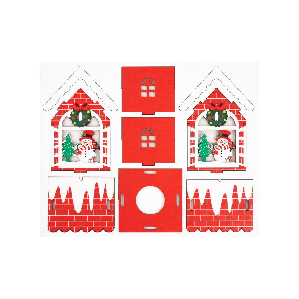 Jedná se o dřevěnou stavebnici ve tvaru vánočního domku, která je navržena pro snadné sestavení. Domeček je ideální jako vánoční dekorace na stůl, parapet nebo poličku. Má výrazné červené a bílé provedení imitující zasněženou střechu a cihly. Uvnitř domku je umístěn sváteční motiv Sněhuláka s dárkem a ptáčkem v zasněžené scéně, doplněný vánočním stromkem a věncem. Součástí balení je i integrovaná lampička (LED osvětlení) a 3 baterie LR1130, které po rozsvícení vytváří útulnou atmosféru. Velikost sestaveného domku je cca 9 x 7,5 cm.Doplňkové parametry