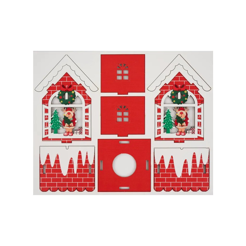 Jedná se o dřevěnou stavebnici ve tvaru vánočního domku, která je navržena pro snadné sestavení. Domeček je ideální jako vánoční dekorace na stůl, parapet nebo poličku. Má výrazné červené a bílé provedení imitující zasněženou střechu a cihly. Uvnitř domku je umístěn sváteční motiv Soba s dárkem a ptáčkem v zasněžené scéně, doplněný vánočním stromkem a věncem. Součástí balení je i integrovaná lampička (LED osvětlení) a 3 baterie LR1130, které po rozsvícení vytváří útulnou atmosféru. Velikost sestaveného domku je cca 9 x 7,5 cm.Doplňkové parametry