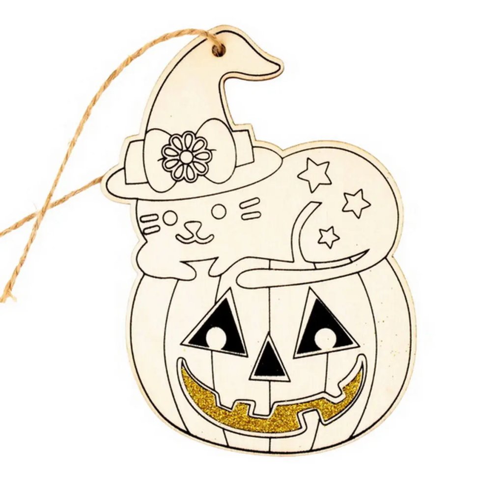 Jedná se o originální dřevěnou závěsnou ozdobu, která je určena k vlastnímu vymalování a kreativnímu dotvoření. Ozdoba má tvar veselé halloweenské dýně, na které je vyobrazena roztomilá kočka s čarodějnickým kloboukem a hvězdičkami. Oči dýně jsou černé a úsměv je zvýrazněn zlatým glitrovým lakem. Je vyrobena z přírodního dřeva a je ideální k dekoraci do interiéru, jako dárková visačka nebo jako zábavný projekt pro děti i dospělé. V horní části je opatřena jutovým provázkem pro snadné zavěšení. Velikost ozdoby je 13 cm.Buďte první, kdo napíše příspěvek k této položce.