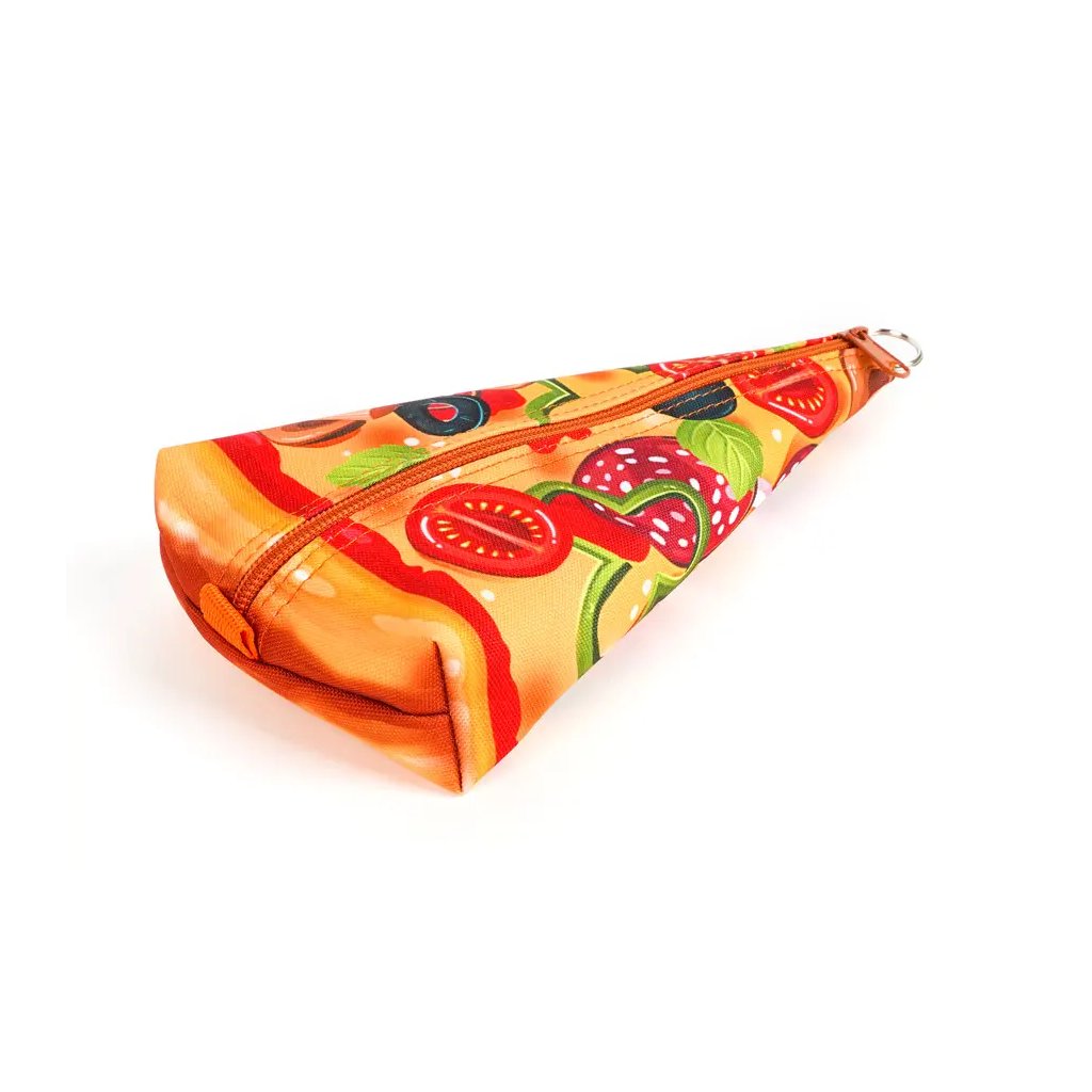Tento originální textilní penál etue ve tvaru výseče pizzy je perfektní volbou pro přehledné uložení psacích potřeb, který si oblíbí školáci i studenti, co hledají něco neotřelého. Penál se vyznačuje omyvatelným tištěným povrchem, který usnadňuje údržbu a zajišťuje dlouhou životnost produktu. Je uzavíratelný kvalitním zipem, který zajišťuje rychlý a bezpečný přístup k tužkám, pastelkám a dalším drobnostem. S rozměry 24,5 x 12,5 x 4 cm poskytuje dostatek místa pro všechny nezbytnosti, aniž by zabíral příliš mnoho prostoru v batohu. Penál je dodáván bez výbavy, což vám umožní naplnit si jej přesně podle vlastních potřeb.Doplňkové parametry