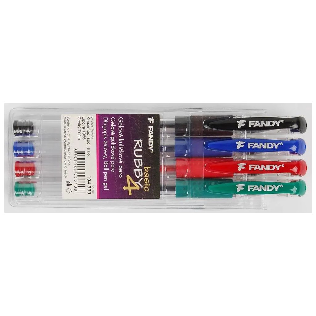 Jedná se o sadu 4 plastových gelových per Rubby Basic v základních barvách: černé, modré, zelené a červené. Pera mají gumovou úchopovou část pro příjemné držení a píší s šířkou stopy 0,5 mm. Jsou skvělá pro školáky, studenty i pro běžné kancelářské použití.Doplňkové parametry