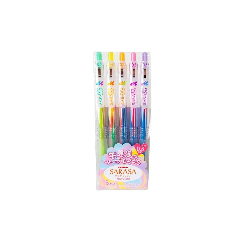 Jedná se o sadu 5 plastových gelových per Sarasa Clip Marble, která se vyznačují stiskacím mechanismem, úchopovou částí z měkčené pryže se zářezy pro pohodlné a pevné držení a kolíčkovým klipem s kovovou sponou, který umožňuje snadné uchycení i na hrubých deskách, a jsou ideální pro školáky i profesionály, kteří hledají kombinaci kvality, designu a praktičnosti. Pera jsou špičkové kvality (Made in Japan), pastelových barvách a píší s šířkou stopy 0,5 mm.Doplňkové parametry